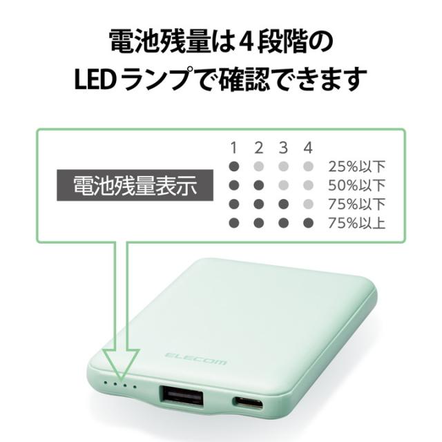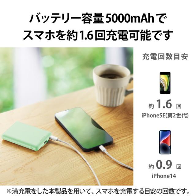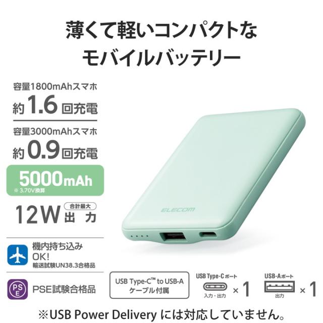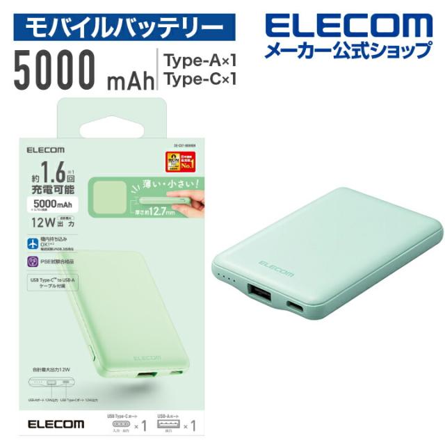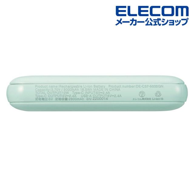 【在庫処分・お買い得!】 エレコム モバイルバッテリー 薄型コンパクト 5000mAh 小型 2.4A Cx1+Ax1 12W対応 グリーン┃DE-C37-5000GN