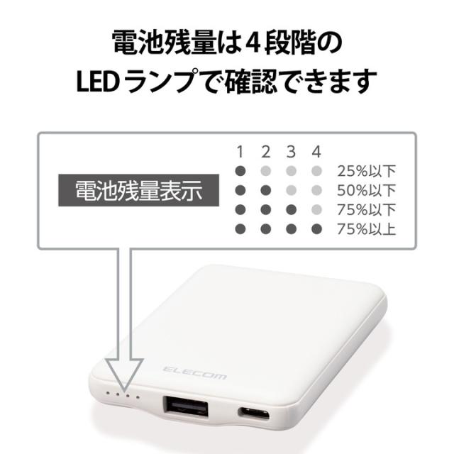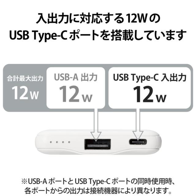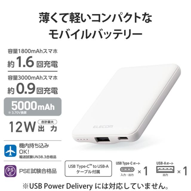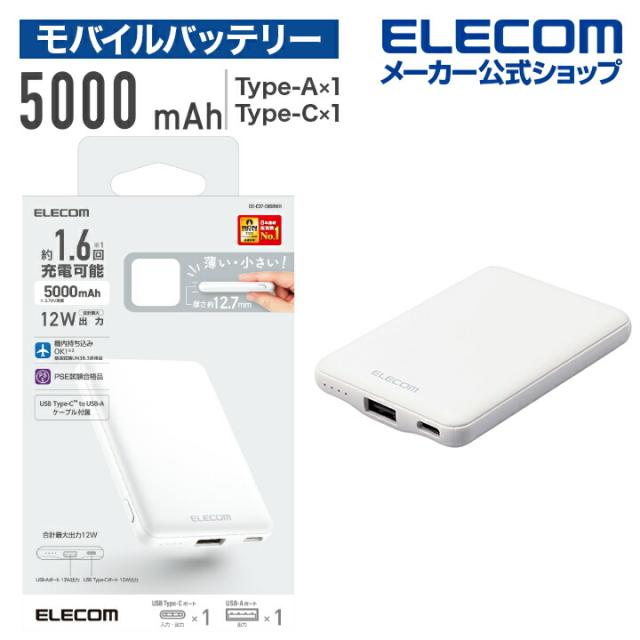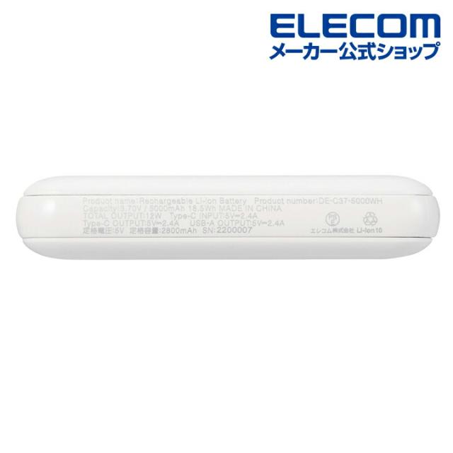 【在庫処分・お買い得!】 エレコム モバイルバッテリー 薄型コンパクト 5000mAh 小型 2.4A Cx1+Ax1 12W対応 ホワイト┃DE-C37-5000WH