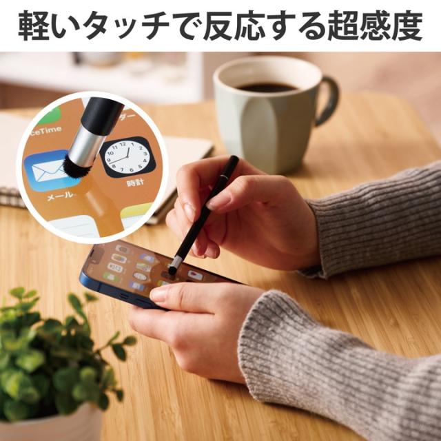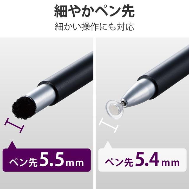 滑らかなペン滑りの超感度タイプと、細かな操作がしやすいディスクタイプの2種類のペン先を採用し、用途で選べる2WAYスリムタッチペンです。![]() ■ペン先直径が5.5mm(超感度タイプ)と5.4mm(ディスクタイプ)で、繊細な操作に適したスマートフォン用スリムタッチペンです。 ■超感度タイプのペン先は、先端に植毛された繊維が広範囲の接地面積を確保することで、ペン先を押し当てることなく、滑らかに操作できます。 ■ディスクタイプのペン先は、ディスクが透明で指している箇所が分かりやすく、細かな操作が可能です。 ■ペン軸が細いため、持ち運びにも便利です。 ■指先でのタッチ操作と違い、液晶画面を汚さずに操作可能です。 ■タッチ操作はもちろん、スライド操作も快適に行えます。 ■※液晶保護フィルムの種類によっては、操作時にこすれ音が生じたり、タッチペンの反応が悪くなったりすることがあります。 ■ペン先への摩擦や、ホコリの侵入などダメージ防ぐ、マグネットタイプのキャップが付いています。 ■自社環境認定基準を1つ以上満たし、『THINK ECOLOGY』マークを表示した製品です。 ■環境保全に取り組み、製品の包装容器において、原料に占める石油系プラスチック代替原料の割合が10%を超えている製品です。 ![]() ■対応機種:各種スマートフォン・タブレット ※特定のアプリ/ソフトをご使用の際に、専用タッチペンのみでの描写設定をされている場合はご使用できない場合があります。 ■外形寸法:長さ約110mm×ペン径約7mm ペン先 超感度 約5.5mm ディスク 約5.4mmm ■材質:ペン先:シリコンゴム、ナイロン繊維ポリカーボネート、本体:アルミニウム ■ストラップ有無:× ■カラー:ブラック |