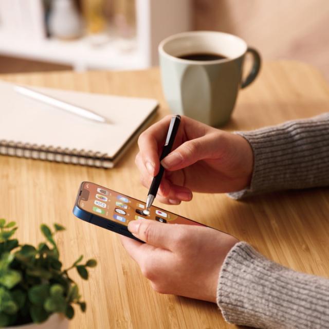 透明なディスクタイプのペン先により、狙い通りに細かな操作ができるスリムタッチペンです。![]() ■ペン先直径が5.4mmで、細かい操作も快適にできるスマートフォン用スリムタッチペンです。 ■ディスクタイプのペン先は、ディスクが透明で指している箇所が分かりやすく、細かな操作が可能です。 ■ペン軸が細いため、持ち運びにも便利です。 ■胸ポケットなどに入れて持ち運べるクリップが付いています。 ■指先でのタッチ操作と違い、液晶画面を汚さずに操作可能です。 ■タッチ操作はもちろん、スライド操作も快適に行えます。 ■※液晶保護フィルムの種類によっては、操作時にこすれ音が生じたり、タッチペンの反応が悪くなったりすることがあります。 ■ペン先への摩擦や、ホコリの侵入などダメージ防ぐ、マグネットタイプのキャップが付いています。 ■自社環境認定基準を1つ以上満たし、『THINK ECOLOGY』マークを表示した製品です。 ■環境保全に取り組み、製品の包装容器において、原料に占める石油系プラスチック代替原料の割合が10%を超えている製品です。 ![]() ■対応機種:各種スマートフォン・タブレット ※特定のアプリ/ソフトをご使用の際に、専用タッチペンのみでの描写設定をされている場合はご使用できない場合があります。 ■外形寸法:長さ約110mm×ペン径約7mm、ペン先約5.4mm ■材質:ペン先:ポリカーボネート、本体:アルミニウム ■ストラップ有無:× ■カラー:ブラック |