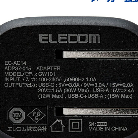 USB Type-C(TM)ポートとUSB-Aポートの合計2ポートを搭載し、GaN(窒化ガリウム)を採用した小型で軽量、かつ高出力なUSB AC充電器です。本製品のUSB Power Delivery最大出力は30Wです。USB Type-C(TM)ポートは、USB Power Deliveryに準拠し対応するノートパソコンやスマートフォン、タブレットなどを超高速充電が可能です。USB-Aポートは最大出力12W(5V/2.4A)で、“おまかせ充電”に対応しています。![]() ■USB Type-C(TM)(USB-C(TM))ポートとUSB-Aポートの合計2ポートを搭載し、GaN(窒化ガリウム)を採用した小型で軽量、かつ高出力なUSB AC充電器です。 ■USB Type-C(TM)ポートは、USB Power Deliveryに準拠し対応するノートパソコンやスマートフォン、タブレットなどを超高速充電が可能です。USB-Aポートは最大出力12W(5V/2.4A)で、“おまかせ充電”に対応しています。 ■GaN(窒化ガリウム)とは従来のシリコンと比べると発熱を抑える事が出来る新材料で、製品の小型化及び軽量化が可能となりました。 ■手のひらにすっぽり隠れるほど小さく(約42mm×30mm×39mm)、軽量(約58g)なので外出や出張などの際の持ち運びに便利です。 ■USB Power Delivery(パワーデリバリー)とは、アダプターと接続機器間で情報をやり取りすることで、その機器間における最適な電力を選択し、高速充電を実現するUSB規格です。 ■※本製品の最大出力は30Wです。 ■端末に応じて出力が5V/3A、9V/3A、15V/2A、20V/1.5Aと可変し、iPhoneなどのスマートフォンから、iPad Airなどタブレット端末、MacBook Airなどのノートパソコンまで幅広く高速充電できます。 ■※USB Power Delivery 30W充電に対応した機種に限ります。 ■USB-Aポートは、最大出力12W(5V2.4A)でスマートフォンやタブレットなどを充電、給電ができます。 ■接続された機器を自動検知し、最適電流で充電できる“おまかせ充電”に対応しています。 ■出力端子が2ポートありますので、スマートフォンなどを2台同時に充電が可能です。 ■※2ポート同時出力時は合計最大15Wとなります。(USB Power Delivery での出力はできません) ■スマートフォン等に付属もしくは対応する充電用USBケーブルを使用して充電可能です。 ■※本製品に充電用ケーブルは付属していません。 ■未使用時は電源プラグを折りたたんで充電器本体に収納可能です。スッキリとコンパクトに収納できるので、持ち運びにも便利です。 ■耐トラッキング性の要求事項(PSE:電気用品安全法)を満たしたコンセントプラグを採用しています。 ■※本製品にケーブルは同梱しておりません。別途MFi認証品のUSB Type-C(TM)(USB-C(TM)) to LightningケーブルやエレコムのUSB規格認証USB Type-C(TM)(USB-C(TM)) to USB Type-C(TM)(USB-C(TM))ケーブル等をご用意ください。 ■※端末本体や充電器が濡れた状態で充電すると、異常な発熱・焼損の原因となり大変危険ですのでおやめください。 ■※USB Type-C(TM) and USB-C are trademarks of USB Implementers Forum ■自社環境認定基準を1つ以上満たし、『THINK ECOLOGY』マークを表示した製品です。 ■廃棄物削減に取り組み、製品に同梱する取扱説明書等をペーパーレス化した製品です。 ■環境保全に取り組み、製品の包装容器におけるプラスチック重量を、社内基準製品より20%以上削減した製品です。 ![]() ■対応機種:USB Type-C(TM)(USB-C(TM))ポートからUSB Power Delivery 3.0(30W)の規格内で充電可能な端末、またはUSB-Aポートから12W(5V2.4A)の規格内で充電が可能な端末。2ポート同時接続時、合計最大15Wまでの出力で充電、給電可能な機器とその組み合わせ。 ■定格入力電圧:AC100-240V 50/60Hz ■定格入力電流:1A ■定格出力電力:USB Type-C(TM)(USB-C(TM)ポート:最大出力30WUSB-Aポート:12W2ポート同時出力時:合計最大15W(USB Power Deliveryでの出力はできません) ■定格出力電圧:USB Type-C(TM)(USB-C(TM)ポート:5V/9V/15V/20V、USB-Aポート:5V2ポート同時出力時:各ポート5V ■定格出力電流:USB Type-C(TM)(USB-C(TM))ポートのみ使用時:5V時3A/9V時3A/15V時2A/20V時1.5A、USB-Aポートのみ使用時:5V時2.4A2ポート同時出力時:合計最大15W(USB Power Delivery での出力はできません) ■外形寸法:幅約42mm×厚み約30mm×高さ約39mm ■重量:約58g ■カラー:ブラック ■使用可能地域:日本 ■保証期間:1年間 ■コネクター形状:USB Type-C(TM)(USB-C(TM))(メス)×1、USB-A(メス)×1 ■コンセントプラグ仕様:90度スイング構造 ■使用温度範囲:0℃〜25℃ ■法令:◇PSE 特定電気用品 ■その他:※USB Type-C and USB-C are trademarks of USB Implementers Forum |