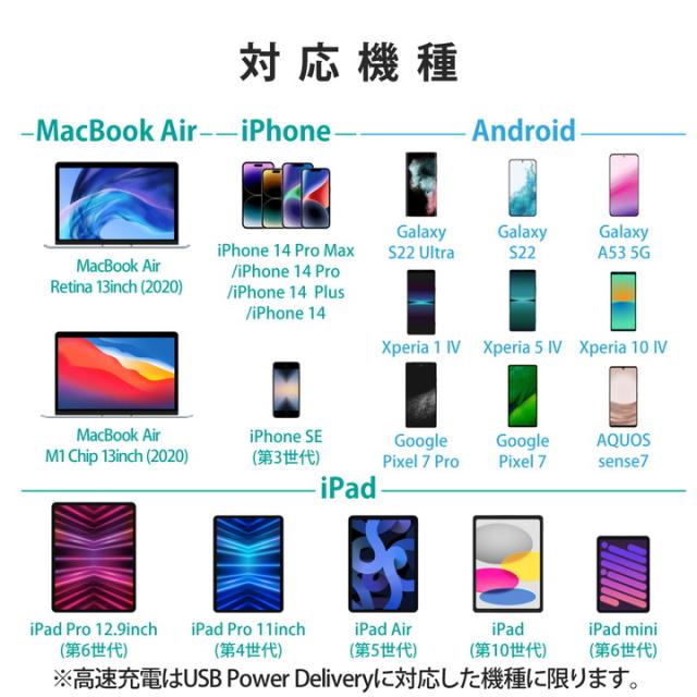 USB Type-C(TM)ポートを1ポート搭載し、GaN(窒化ガリウム)を採用した小型で軽量、かつ高出力なUSB AC充電器です。USB Power Deliveryに対応し対応するノートパソコンやスマートフォン、タブレットなどを超高速充電が可能です。本製品のUSB Power Delivery最大出力は45Wです。PPSに対応する機器の場合には端末に最適な出力で効率的に電源を供給できます。![]() ■USB Power Deliveryに対応したUSB Type-C(TM)(USB-C(TM))ポートを搭載し、対応するノートパソコンやスマートフォン、タブレットなどを超高速充電できます。 ■GaN(窒化ガリウム)を採用した小型で軽量、かつ高出力なUSB AC充電器です。 ■GaN(窒化ガリウム)とは従来のシリコンと比べると発熱を抑える事が出来る新材料で、製品の小型化及び軽量化が可能となりました。 ■手のひらにすっぽり隠れるほど小さく(約42mm×35mm×35mm)、軽量(約69g)なので外出や出張などの際の持ち運びに便利です。 ■USB Power Delivery(パワーデリバリー)とは、アダプターと接続機器間で情報をやり取りすることで、その機器間における最適な電力を選択し、高速充電を実現するUSB規格です。 ■※本製品の最大出力は45Wです。 ■端末に応じて出力が5V/3A、9V/3A、15V/3A、20V/2.25Aと可変し、iPhoneなどのスマートフォンから、iPad Airなどタブレット端末、Windowsなどのノートパソコンまで幅広く高速充電できます。 ■※USB Power Delivery 45W充電に対応した機種に限ります。 ■PPSに対応する機器の場合、端末に最適な出力で効率的に電源を供給することができます。 ■※PPS(Programmable Power Supply)はUSB-PD3.0のオプション規格です。 ■本製品はUSB-IFのテストと同等のテストを弊社独自で実施し、高い安全性が保たれています。USB Power Delivery対応製品にご使用いただけます。 ■スマートフォン等に付属もしくは対応する充電用USBケーブルを使用して充電可能です。 ■※本製品に充電用ケーブルは付属していません。 ■未使用時は電源プラグを折りたたんで充電器本体に収納可能です。スッキリとコンパクトに収納できるので、持ち運びにも便利です。 ■耐トラッキング性の要求事項(PSE:電気用品安全法)を満たしたコンセントプラグを採用しています。 ■※本製品にケーブルは同梱しておりません。別途MFi認証品のUSB Type-C(TM)(USB-C(TM)) to LightningケーブルやエレコムのUSB規格認証USB Type-C(TM)(USB-C(TM)) to USB Type-C(TM)(USB-C(TM))ケーブル等をご用意ください。 ■※端末本体や充電器が濡れた状態で充電すると、異常な発熱・焼損の原因となり大変危険ですのでおやめください。 ■※USB Type-C(TM) and USB-C are trademarks of USB Implementers Forum ■自社環境認定基準を1つ以上満たし、『THINK ECOLOGY』マークを表示した製品です。 ■廃棄物削減に取り組み、製品に同梱する取扱説明書等をペーパーレス化した製品です。 ■環境保全に取り組み、製品の包装容器におけるプラスチック重量を、社内基準製品より20%以上削減した製品です。 ![]() ■対応機種:USB Type-C(TM)(USB-C(TM))ポートからUSB Power Delivery 3.0(45W)の規格内で充電可能な端末。USB Power Delivery 3.0のオプション規格内であるPPS(Programmable Power Supply)の充電規格内で充電可能な端末。 ■定格入力電圧:AC100-240V 50/60Hz ■定格入力電流:1.8A ■定格出力電力:最大出力時:45WPPS最大出力時:45W ■定格出力電圧:5V/9V/15V/20VPPS出力:3.3V-16V/3.3V-21V ■定格出力電流:5V時3A/9V時3A/15V時3A/20V時2.25APPS出力:3.3V-16V時3.0A/3.3V-21V時2.25A ■外形寸法:幅約42mm×厚み約35mm×高さ約35mm ■重量:約69g ■カラー:ホワイト ■使用可能地域:日本 ■保証期間:1年間 ■コネクター形状:USB Type-C(TM)(USB-C(TM))(メス)×1 ■コンセントプラグ仕様:90度スイング構造 ■使用温度範囲:0℃〜25℃ ■法令:◇PSE 特定電気用品 ■その他:※USB Type-C and USB-C are trademarks of USB Implementers Forum |