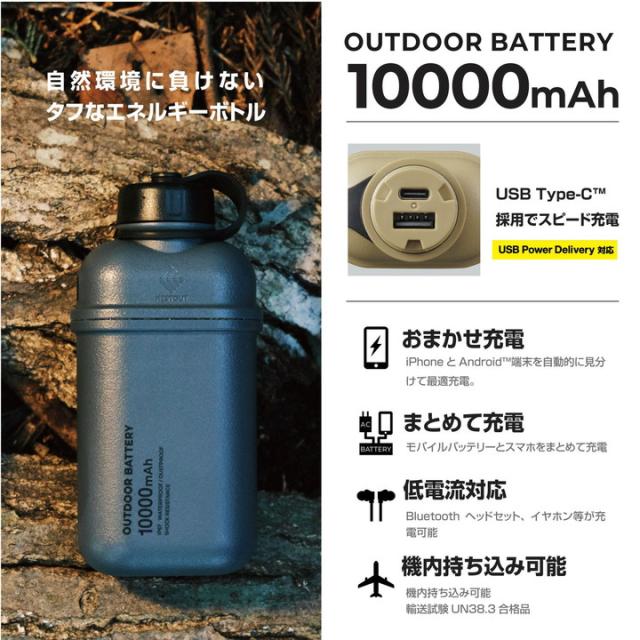 アウトドアシーンに最適な防水・防塵・耐衝撃のモバイルバッテリー。リチウムイオン電池を衝撃や振動から守るクッション構造とJIS保護等級IP67相当の防水防塵性能で、屋外での落下や水濡れからバッテリーを守ります。別売りのパーツを取り付けると、LEDランタンなどのアウトドアギアとして使えるアウトドア特化型モデルです。![]() ■アウトドアに特化したブランド“NESTOUT(ネストアウト)”のアウトドアバッテリーシリーズ。 ■アウトドア環境での水や砂に強い、JIS保護等級IP67相当の防水・防塵タイプのモバイルバッテリーです。 ■外側からの圧力に強い丸みを帯びた設計と、リチウムイオン電池をシリコンクッションで包みこみ振動や衝撃を吸収する構造で、万が一の落下や衝撃から守ります。 ■別売りのパーツを取り付けることで、LEDランタンなど様々なアウトドアギアとして使うことができます。(パーツは使用後モバイルバッテリーから必ず取り外してください、挿したままだと電池が減る原因となります) ■キャンプギアやアウトドアギアと馴染むデザイン、カラーリングです。 ■USBポートに搭載した高性能ICが接続機器を自動で見分けて最適な出力で最速に充電できる“おまかせ充電”に対応しています。 ■Bluetoothヘッドセット・イヤホンなどの充電電流の小さい小型電子機器も最適な電流で充電することができます。 ■モバイルバッテリーの底部にはカメラネジ規格の1/4インチねじ穴があいているので、三脚などを取り付ける事ができます。 ■モバイルバッテリー本体を約2時間45分で充電でき、チャージ時間を大幅に短縮することができます。 ■※USB Power Delivery 18W以上のAC充電器にUSB Type-C(TM)(USB-C(TM)) to USB Type-C(TM)(USB-C(TM))ケーブルを接続し充電した時間です。 ※USB Type-C and USB-C are trademarks of USB Implementers Forum ■USB-Aポート、USB Type-C(TM)(USB-C(TM))ポートをそれぞれ1ポートずつ搭載しており、2ポート合計20Wの出力が可能な高出力モデルです。 ※USB-AポートとUSB Type-C(TM)(USB-C(TM))ポートの同時使用時、各ポートからの出力は接続機器により異なります。 ■本製品(バッテリー容量10000mAh)で、1800mAhのスマートフォンを約3.3回、3000mAhのスマートフォンを約1.9回充電可能です。 ■※満充電した本製品で電源オフの状態のスマートフォンを充電する際の目安回数です。充電中に電源を入れたり、機器を使用したりしている場合は記載の数値まで充電できない場合があります。 ■持ち運びに最適な小型USB-A to USB Type-C(TM)(USB-C(TM))ケーブルを付属しています。USB協会指定の試験に合格した信頼性の高いUSB Type-C(TM)(USB-C(TM))コネクターを搭載していますので安心・安全に使用いただけます。 ■USB Type-C(TM)(USB-C(TM))コネクターは、ウラ、オモテに関係なく両面で挿すことが可能です。 ■iPhoneに付属もしくは対応したLightningケーブルを利用することで、iPhoneも充電可能です。 ■スマートフォンとモバイルバッテリーを充電できる“まとめて充電”に対応しています。 ■電池残量は5段階のLEDランプ点灯で確認可能です。 ■1000回繰り返し使用可能な充電式リチウムイオン電池を搭載しています。 ■内蔵の充電式リチウムイオン電池は、JIS C8711およびJIS C8712(JIS C8714の内容を含む)に準拠した安全設計です。 ■日本の電気用品安全法(PSE)の技術基準に適合した安全性の高い商品です。 ■過充電・過放電・過電圧・過電流防止機能および短絡保護機能と温度検知機能の6つの保護機能を備えた安心の回路設計です。 ■※工場出荷時に70%程度充電されています。充電式リチウムイオン電池は時間とともに放電するので、ご使用になる前に充電することを推奨します。 ■本製品は、一般社団法人JBRCの回収対象製品であり、回収協力自治体や協力店(家電量販店・HCなど)で回収が可能です。 ■※JBRCのホームページでお住まいの地域の回収協力自治体・協力店をご確認ください。 ■自社環境認定基準を1つ以上満たし、『THINK ECOLOGY』マークを表示した製品です。 ■環境保全に取り組み、製品の包装容器におけるプラスチック重量を、社内基準製品より20%以上削減した製品です。 ![]() ■対応機種:iPhoneおよびUSB端子で充電するスマートフォン、タブレット、他小型電子機器 ■コネクター形状(電源入力側):USB Type-C(TM)(USB-C(TM))ポート ■定格入力電圧:5V/9V ■定格入力電流:3A/2A ■コネクター形状(電源出力側):USB Type-Cポート×1、USB-Aポート×1 ※USB Type-C(ポートは電源LED消灯時に接続した場合のみUSB Power Delivery20Wで出力可 ■定格出力電圧:USB Type-C:5V/9V、USB-A:5V ※USB-AポートとUSB Type-Cポートの同時使用時、USB Type-Cポートの電圧は5Vに固定 ■定格出力電流:合計20W USB Type-C:3A/2.22A、USB-A:2.4A ■電池種類:充電式リチウムイオン電池 ■電池定格容量:3.6V/10000mAh 36.0Wh ■充電時間:約2時間45分 ※USB Power Delivery 18W以上のAC充電器を使用した場合 ■動作温度:充電時:0℃〜40℃、放電時:-20℃〜40℃ ■外形寸法:幅約61mm×奥行約36mm×高さ約126mm ■重量:約241g ■カラー:サンドベージュ ■くり返し使用回