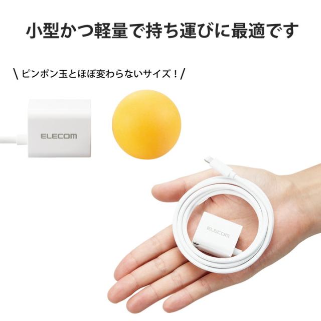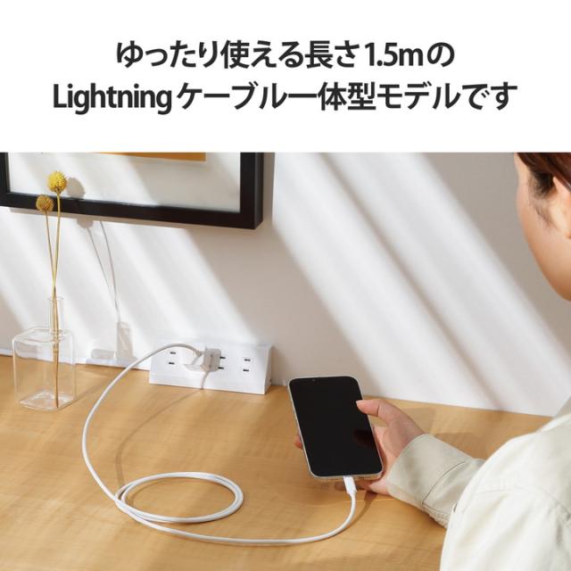 Lightningコネクターを搭載し、Lightningコネクター搭載のiPhone、iPad、iPodを超高速充電できるUSB AC充電器です。手のひらにすっぽり隠れるほど小さく、軽量なので外出や出張などの際の持ち運びに便利です。Lightningコネクターの一体型ケーブルはゆったり接続できる長さ1.5mです。