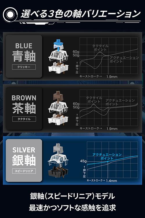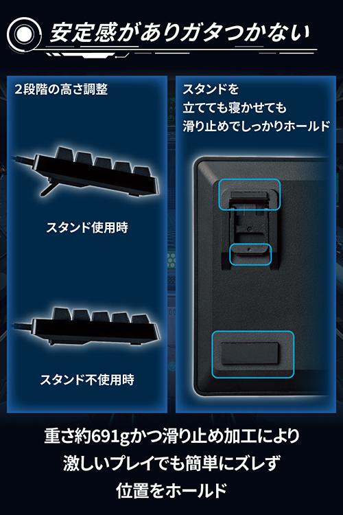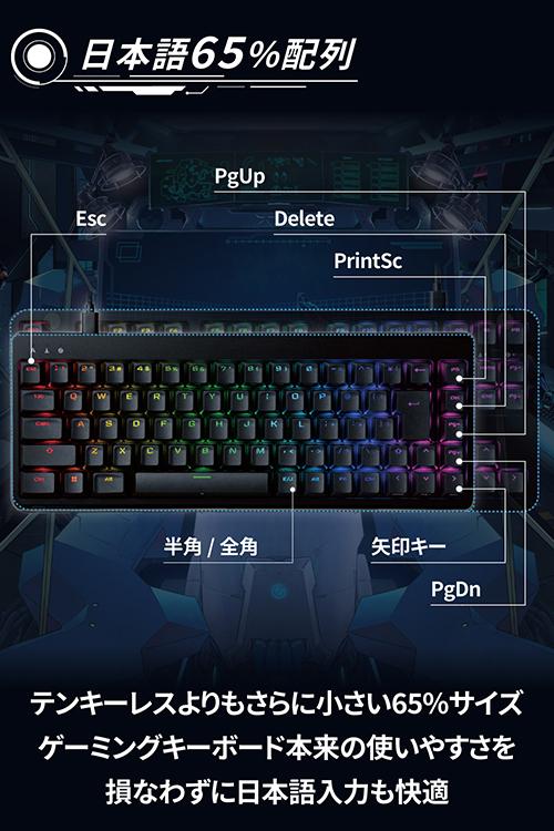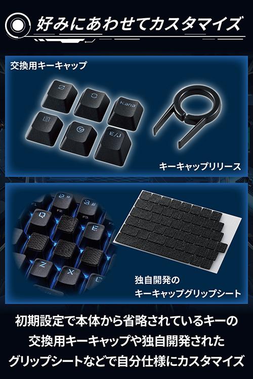 最適って、最強。エレコムのハイクラス・ゲーミングデバイス“ELECOM GAMING V custom”シリーズ。ガンシューティング系ゲーム(FPS)の高速な指の動きにもぴったりハマるよう最適化された、銀軸搭載の65%サイズゲーミングキーボードRGB LED搭載モデル“VK300S”。![]() ■“ELECOM GAMING V custom”は、プロからエントリーまで、勝ちにこだわるすべてのプレイヤーの皆様と向き合い、数値性能だけでなく、感覚的な使い心地を大切に作り込んだ、一人ひとりにぴったりハマる“勝てるデバイス”をお届けする、エレコムの新しいハイクラス・ゲーミングデバイスシリーズです。 ■ガンシューティング系ゲーム(FPS)の高速な指の動きにもぴったりハマるサイズ感、キー配列、キー形状を精緻に作り上げた、銀軸搭載の65%サイズゲーミングキーボード、LED搭載モデルです。 ■キー入力における応答速度(Speed)、精度(Precision)、安定性(Stability)を高めた新開発のゲーミングキーボード用エンジン“ELECOM Wireless S.P.S Engine for Keyboard”を搭載しています。 ■“ELECOM Wireless S.P.S Engine for Keyboard”は、独自の測定方法による正確な応答速度の計測と、プロゲーマーによる感性評価により、応答速度を当社比で約55%高速化し、さらに、緻密な精度と安定性の向上を行うことで、業界最速クラスの実効応答速度を実現しています。 ■プロゲーマーを含むプロジェクトチームにて、幾多の試作の末に生み出された“ネオクラッチキーキャップ”は、キーが指にグッと食いつきつつも離れやすいといった、ゲームプレイに最適で操作ミスをしにくいキー形状を実現しています。 ■WASDをホームポジションとして、その周辺キーを縦横高速に往復するゲーム特有の指の動きを邪魔しないよう、一つひとつのキーの相対高さや角度を最適化しています。 ■ゲームプレイ中の各指のキーストローク角度を研究し尽くし、高速で打ち込んでも指がずれないようキートップをラウンドさせ、Z〜Mキーは左手親指での操作に最適化した特殊なアシンメトリー形状を採用しています。 ■キーの印字は、色の異なるプラスチック材料で文字を成形する“ダブルインジェクションPBTキーキャップ”を採用し、キー印字の塗装が剥がれにくい、圧倒的な耐摩耗性を実現しています。 ■デスク上でマウスの操作スペースを最大限に確保できる65%サイズの独自日本語配列を採用しています。 ■コンパクト配列のキーボードでは省略されやすいESCキーなどのゲーム中の操作頻度が高いキーや、スクリーンショット撮影のPrintScreenキー、観戦中に便利なPageUpキー、PageDownキーを搭載しています。 ■テキスト入力とゲームプレイのしやすさを両立させるため、プレイヤー同士のチャットなど、日本語入力もスムーズに行えるよう、半角全角キーや方向キー、Deleteキーを搭載し、スペースキーを広くとった日本語環境のプレイヤーに最適な配列です。 ■専用設定ソフトウェア“EG Tool”を使用すると、全キーの機能をカスタマイズできます。 ■変換、無変換、かな、メニュー、Gaming、EJキーの6つの純正キーキャップを同梱しているため、キーを取り換えることで各プレイヤーの入力スタイルへの最適化も可能です。 ■※キーへの機能割当を変更する場合は、専用設定ソフトウェアでの設定が必要です。 ■本体上面には、ワイヤレスゲーミングマウスと本品をあわせて使用する際に便利な、“追加USBポート”を搭載しています。 ■“追加USBポート”によって、ワイヤレスマウスの近くにマウス用レシーバーを配置できるため、パソコン本体に配置するよりも電波が届きやすく、快適なゲーミング環境を実現します。 ■“追加USBポート”は、1000Hzの1ポーリング(1ミリ秒)にも満たない、わずか約200マイクロ秒という極限の遅延軽減を施したUSBハブ方式を採用しています。 ■また、ワイヤレス接続の際に電波障害の原因となる、パソコンなどからのノイズをブロックするEMI対策を行っています。 ■ケーブルは、取り回しがしやすい驚きの柔軟性を持った“着脱式USB Type-C(TM)パラコードケーブル”を採用しています。 ■ケーブルのコネクターは、ゲームを行う場所の移動時やデスク周りの掃除に便利で、万が一の断線時にも簡単に交換できるUSB Type-C(TM)着脱式を採用しています。 ■スピーディーな押下とソフトな感触を追求した銀軸(スピードリニア)を搭載しています。 ■技術者の知見とプロゲーマーの鋭い感性から打鍵感、品質、コストのバランスに優れたパーツを選定し、実用性に優れた最適なコストパフォーマンスを実現しています。 ■キートップに、視認性に優れたステンシル調のフォントを印字しています。 ■全てのキーに、ゲーム環境を彩る 1677万色RGBライティングを搭載しています。 ■専用設定アプリのEG Toolを使用することで、光り方のパターン、速度、色などを好みに合わせてカスタマイズすることが可能です。 ■すべてのキーが同時入力が可能な“Nキーロールオーバー”に対応しています。 ■複雑なキ
