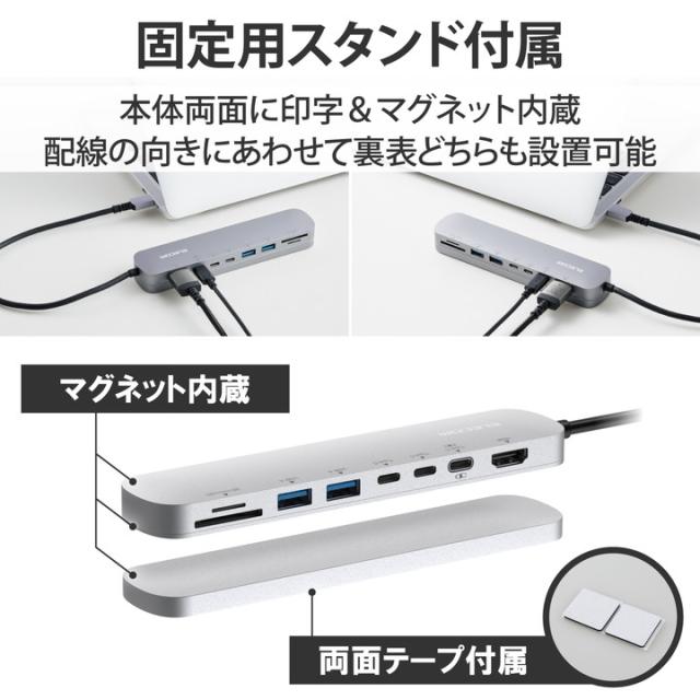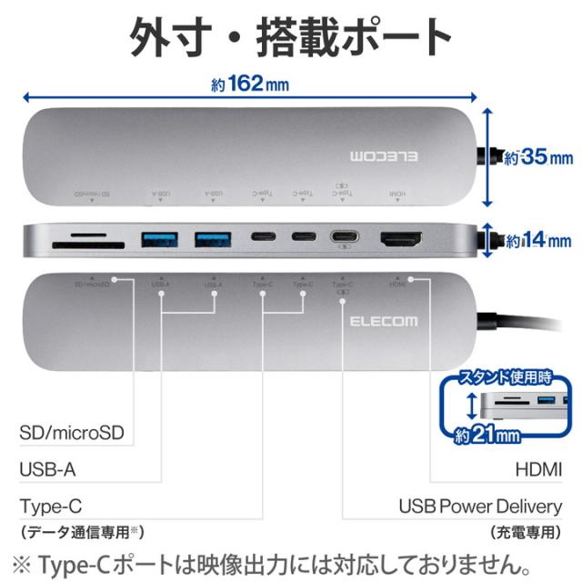 USB 10Gbps(USB3.2(Gen2))に対応したUSB Type-C(TM)ポートを搭載したドッキングステーションです。全てのポートを本体1面に搭載し、両面テープでデスクに固定できるスタンド付きのため、ピタッと固定し、すっきり使用できます。![]() ■USB Type-C(TM)コネクターでパソコンに接続し、USB機器やHDMIディスプレイを接続できるドッキングステーションです。 ■パソコン本体との接続は、最大10Gbps(理論値)の超高速データ転送を実現するUSB 10Gbps(USB3.2(Gen2))に対応しています。 ■USB 10Gbps(USB3.2(Gen2))に対応したUSB Type-C(TM)を2ポート搭載しています。 ■※データ通信専用、映像出力には対応していません。 ■※USB 10Gbpsでご使用になるには、お使いのパソコン・デバイスがUSB 10Gbpsに対応している必要があります。 ■USB Power Deliveryに対応したUSB Type-C(TM)を1ポート搭載しています。 ■USB Type-C(TM)コネクターを経由して最大100W(※)の電力をデバイス/パソコン本体に供給するUSB Power Deliveryに対応しています。 ■USB Type-C(TM)電源アダプターを接続することで、本製品を経由し、パソコン本体を充電することができます。 ■※製品本体にて15Wを消費しますので、実際の出力は最大85Wとなります。 ■※85Wで給電が必要な場合は、100W出力の充電器をご用意ください。 ■USB 10Gbps(USB3.2(Gen2))に対応したUSB Standard-Aポートを2ポート搭載しています。 ■パソコンから外部モニターへ映像出力ができるHDMIポートを搭載しています。 ■※本製品で映像出力を行う際は、機器がDisplayPort(TM) Alt modeに対応していることを確認してください。 ■SDXC/SDHCに対応した、SDカードスロットとmicroSDカードスロットを搭載しています。 ■USB Type-C(TM)コネクターは、表と裏がなく、向きを気にせず差し込み可能です。 ■※USB Type-C(TM)コネクターを標準搭載するパソコンでのみ使用可能です。 ■放熱性と耐ノイズ性に優れ、高級感のあるアルミ筺体を使用しています。 ■持ち運びしやすいスリムタイプです。 ■ケーブルは紛失の心配がない直付けタイプです。タブレットPC/2in1パソコンでもゆったり接続できるケーブル長約30cmです。 ■全てのポートを本体1面に搭載しているので、接続したケーブルを配線しやすく、デスクが煩雑になりません。 ■両面テープでデスクに固定できるスタンド付きです。製品本体はマグネットでスタンドに設置できるので、着脱も簡単です。 ■本体はシンメトリーデザインになっていますので、表裏どちらでもスタンドに設置可能です。 ■※USB Type-C(TM)コネクターからの充電に対応しない本体の場合、本製品のUSB Type-C経由での本体充電はできません。充電を行う際は、機器がUSB Power Deliveryに対応していることを確認してください。 ■※本製品はOS起動前のシステム画面やBIOS画面では動作しません。 ■※本製品はパソコン本体のUSB Type-C(TM)端子に直接接続してください。USBハブや増設ボードのUSB Type-C(TM)端子に接続した場合、本製品をご利用いただけません。 ■※USB Type-C and USB-C are trademarks of USB Implementers Forum ■自社環境認定基準を1つ以上満たし、『THINK ECOLOGY』マークを表示した製品です。 ■廃棄物削減に取り組み、製品に同梱する取扱説明書等をペーパーレス化した製品です。 ■環境保全に取り組み、製品の包装容器におけるプラスチック重量を、社内基準製品より20%以上削減した製品です。 ■環境保全に取り組み、製品の包装容器が紙・ダンボール・ポリ袋のみで構成されている製品です。 ![]() ■対応OS(Windows):Windows 11/Windows 10 ■対応OS(macOS):macOS Ventura 13/macOS Monterey 12 ■対応OS(iPadOS):iPadOS 16 ■対応OS 備考:※各OSの最新バージョンへのアップデートや、サービスパックのインストールが必要になる場合があります。 ■コネクター仕様(アップストリーム):USB Type-C(TM)<USB 10Gbps(USB3.2(Gen2))>、USB Power Delivery対応(最大入力100W / 最大出力85W)、DisplayPort(TM) Alt mode (USB2.0接続時は、USB2.0互換で動作(USB2.0時は、映像出力非対応)) ■USBポート(ダウンストリーム):1:USB Type-C(TM)<USB 10Gbps(USB3.2(Gen2))>×2 ※データ通信専用、映像出力には対応していません。 ■USBポート(ダウンストリーム):2:USB Type-C(TM)×1<最大出力85W> ※充電専用USB Power Deliveryポート ■USBポート(ダウンストリーム):3:USB Standard-A<USB 10Gbps(USB3.2(Gen2))、供給電力値:2ポート合計 4.5W(5V/0.9A)>×2 ■映像出力ポート(ダウンストリーム):HDMI×1<対応解像度:最大4K/60Hz> ■カードリーダー(ダウンストリーム):1:SDメモリーカード、対応メディア:SD(HighSpeed/ProHighSpeed/Class2/4/6/10)、SDHC(Class2/4/6/10/UHS-I)、SDXC(Class10/UHS-I) ■カードリーダー(ダウンストリーム):2:microSDメモリーカード、対応メディア:microSD、microSDHC(Class2/4/6/10/UHS-I)、microSDXC(Class10/UHS-I) ■電源方式:バスパワー ■ケーブル長:約30cm ※コネクター含まず ■カラー:シルバー ■外形寸法:1:製品本体(固定用スタンド含まず):幅約162mm×奥行約35mm×高さ約14mm ※ケーブル含まず ■外形寸法:2:製品本体+固定用スタンド:幅約162mm×奥行約35mm×高さ約21mm ※ケーブル、突起部分含まず ■動作環境:温度5〜40℃、湿度30〜80% ※結