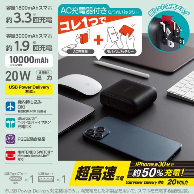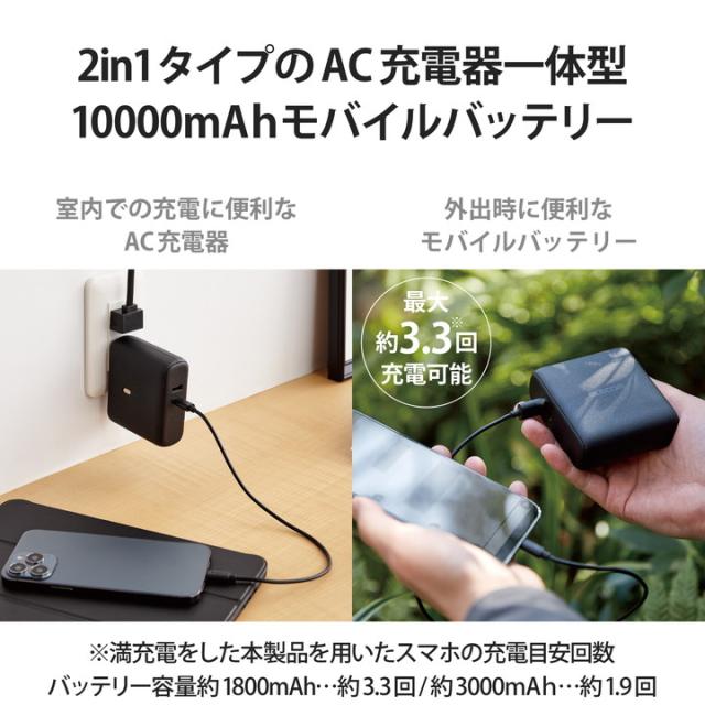 AC充電器としてもモバイルバッテリーとしても使用可能な2in1タイプ!USB Power Delivery規格に準拠し、20Wの高出力で対応機器を超高速充電できる、10000mAhのAC充電器一体型モバイルバッテリーです。