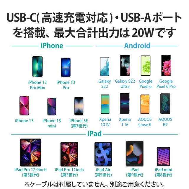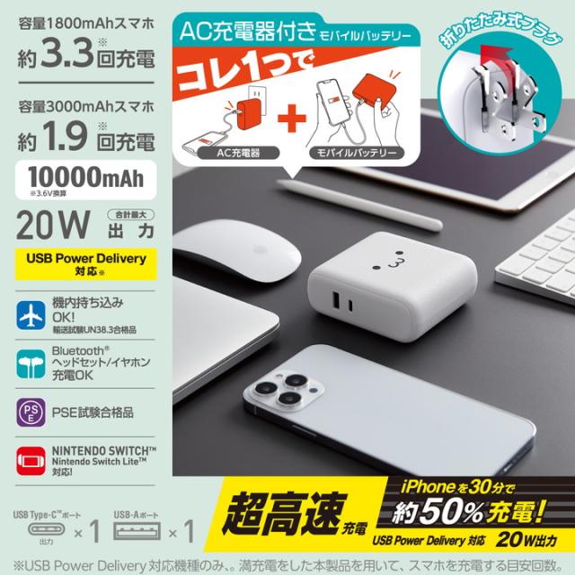 AC充電器としてもモバイルバッテリーとしても使用可能な2in1タイプ!USB Power Delivery規格に準拠し、20Wの高出力で対応機器を超高速充電できる、10000mAhのAC充電器一体型モバイルバッテリーです。