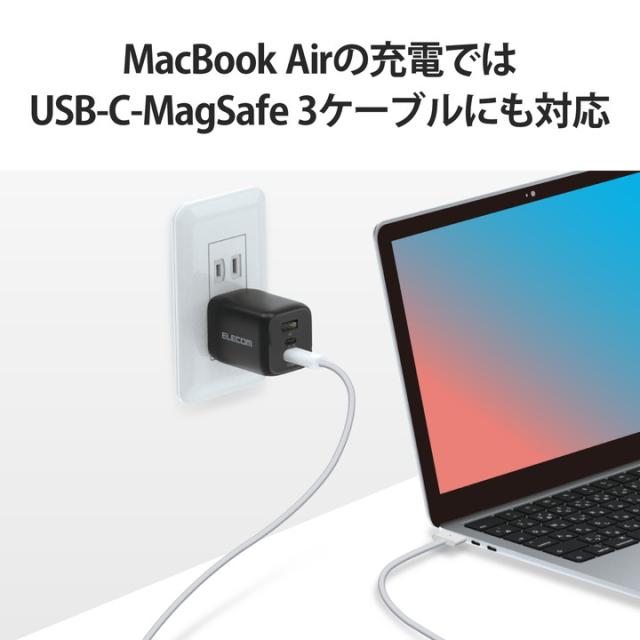 USB Type-C(TM)(USB-C(TM))ポートとUSB Type-Aポートの合計3ポートを搭載し、iPhoneなどのスマートフォンと完全ワイヤレスイヤホンとWindowsなどのノートパソコンを3台同時充電できるUSB AC充電器です。小型・軽量なので外出や出張などの際の持ち運びに便利です。![]() ■USB Type-C(TM)(USB-C(TM))ポートとUSB-Aポートの合計3ポートを搭載し対応するスマートフォン、タブレット、ノートパソコンなどを充電できる、GaN(窒化ガリウム)を採用し小型で軽量なUSB AC充電器です。 ■※USB Power Delivery規格65Wまでで充電できる機器に限ります。 ■出力端子が3ポートあるので、iPhoneなどのスマートフォンと完全ワイヤレスイヤホンとWindowsなどのノートパソコンを3台同時充電できます。 ■※2ポート以上同時出力時は合計最大65Wとなります。 ■USB Type-Cポートは、USB Power Delivery規格、オプションのPPS(Programmable Power Supply)規格に対応し、同規格に対応するノートパソコンやスマートフォン、タブレットなどを充電可能です。 ■USB Type-Cポート単独使用時、機器に応じて出力が5V/3A、9V/3A、12V/3A、15V/3A、20V/3.25Aと可変し、iPhoneなどのスマートフォンから、iPadなどのタブレット、高性能なWindowsノートパソコンまで幅広く充電できます。 ■USB-Aポートは、最大出力12W(5V2.4A)でスマートフォンや完全ワイヤレスイヤホン、スマートウォッチなどを充電、給電ができます。 ■接続された機器を自動的に見分けて適した出力で充電できる“おまかせ充電”に対応しています。 ■小型・軽量なので外出や出張などの際の持ち運びに便利です。 ■未使用時は、電源プラグを折りたたんで充電器本体に収納できるので持ち運びにも便利です。 ■耐トラッキング性の要求事項(PSE:電気用品安全法)を満たしたコンセントプラグを採用しています。 ■USB Power Delivery(パワーデリバリー)とは、アダプターと接続機器間で情報をやり取りすることで、その機器間における最適な電力を選択し、高速充電を実現するUSB規格です。 ■本製品はUSB-IFのテストと同等のテストを弊社独自で実施し、高い安全性が保たれており、USB Power Delivery対応製品にご使用いただけます。 ■PPS(Programmable Power Supply)とは0.2V単位で電圧を調整し、最適な電力で効率的に供給することができるUSB Power Delivery 3.0のオプション規格です。 ■※本製品のUSB Power Delivery最大出力は65Wです。PPS(Programmable Power Supply)最大出力は45Wです。 ■※本製品にケーブルは同梱しておりません。別途MFi認証品のUSB Type-C - Lightningケーブルや、エレコムのUSB規格認証USB Type-C - USB Type-Cケーブル等をご用意ください。 ■※機器本体や充電器が濡れた状態で充電すると、異常な発熱・焼損の原因となり大変危険ですのでおやめください。 ■※USB Type-C and USB-C are trademarks of USB Implementers Forum ■自社環境認定基準を1つ以上満たし、『THINK ECOLOGY』マークを表示した製品です。 ■廃棄物削減に取り組み、製品に同梱する取扱説明書等をペーパーレス化した製品です。 ■環境保全に取り組み、製品の包装容器におけるプラスチック重量を、社内基準製品より20%以上削減した製品です。 ■環境保全に取り組み、製品の包装容器が紙・ダンボール・ポリ袋のみで構成されている製品です。 ![]() ■対応機種:各USB Type-C(TM)(USB-C(TM))ポートからUSB Power Delivery (65W)及びオプション規格であるPPS(Programmable Power Supply)、またはUSB-Aポートから12Wの規格内で充電が可能な機器。2ポート以上同時接続時、合計最大65Wまでの出力で充電、給電可能な機器とその組み合わせ。 ■コネクター形状:USB Type-C(TM)(USB-C(TM))ポート×2、USB-Aポート×1 ■定格入力電圧:AC100〜240V、50/60Hz ■定格入力電流:2A ■外形寸法:幅約52mm×厚み約38mm×高さ約40.5mm ■重量:約112g ■カラー:ブラック ■コンセントプラグ仕様:90度スイング構造 ■使用温度:0℃〜35℃ ■法令:◇PSE 特定電気用品 ■保証期間:1年間 ■その他:※USB Type-C and USB-C are trademarks of USB Implementers Forum ■定格出力電力1:単独接続時:USB Type-C1(TM)(USB-C1(TM))/USB Type-C2ポート最大出力65W、PPS最大出力45W、USB-Aポート最大出力12W ■定格出力電力2:2ポート同時接続時(1):USB Type-C1+USB Type-C2ポート:合計最大出力65W、USB Type-C1ポート最大出力45W、PPS最大出力45W、USB Type-C2ポート最大出力20W、PPS最大出力20W ■定格出力電力3:2ポート同時接続時(2):USB Type-C1+USB-A ポート:合計最大出力57W、USB Type-C1ポート最大出力45W、PPS最大出力45W、USB-Aポート最大出力12W、USB Type-C2+USB-Aポート:合計最大出力15W、USB Type-C2ポート最大出力7.5W、USB-Aポート最大出力7.5W ■定格出力電力4:3ポート同時接続時:合計最大出力60W、USB Type-C1ポート最大出力45W、PPS最大出力45W、USB Type-C2ポート最大出力7.5W、USB-Aポート最大出力7.5W ■定格出力電圧1:単独接続時:USB Type-C1(TM)(USB-C1(TM))/USB Type-C2ポート:5V/9V/12V/15V/20V、PPS出力3.3〜16V、USB-Aポート:5V ■定格出力電圧2:2ポート同時接続時(1):USB Type-C1+USB Type-C2ポート:USB Type-C1ポート:5V/9V/12V/15V/20V、PPS出力3.3〜16V、USB Type-C2ポート:5V/9V、PPS出力3.3〜11V ■定格出力電圧3:2ポート同時接続時(2):USB Type-C1+USB-Aポー