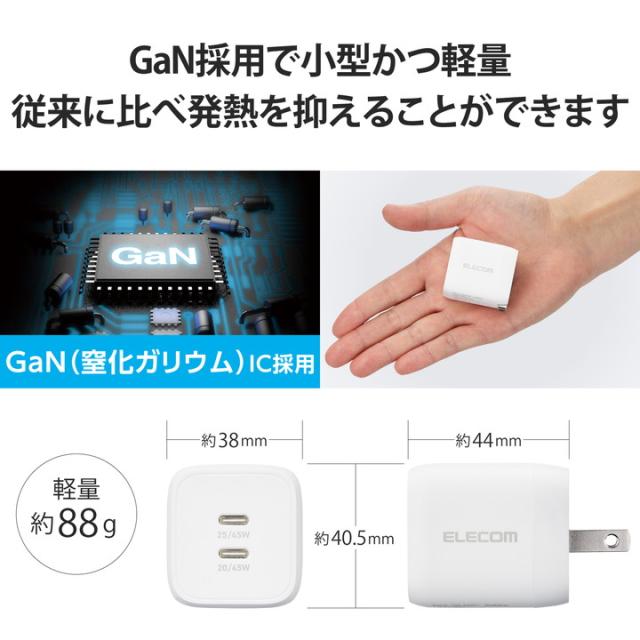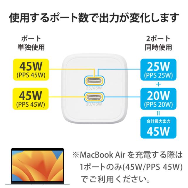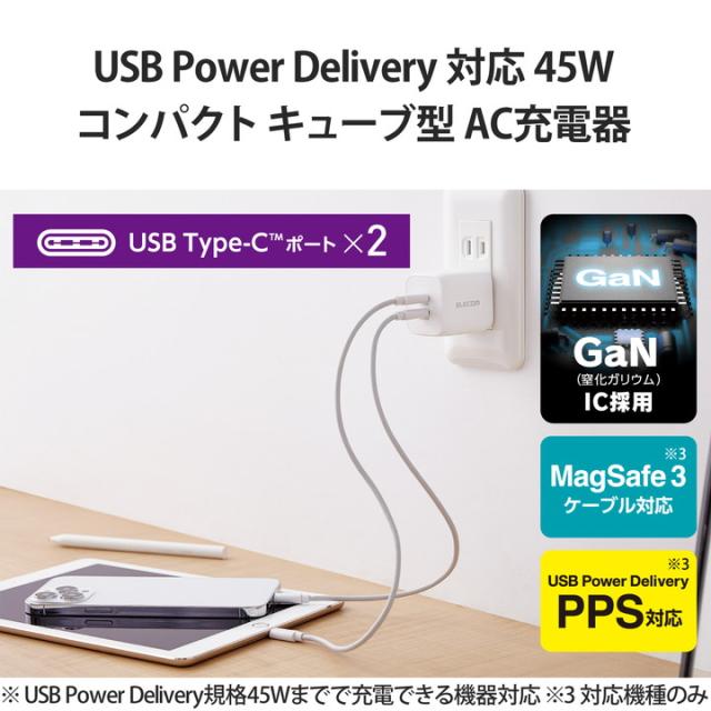 エレコム AC充電器 45W 出力 Type-C 2ポート USB PD 対応 PPS対応 ホワイト┃EC-AC4245WH