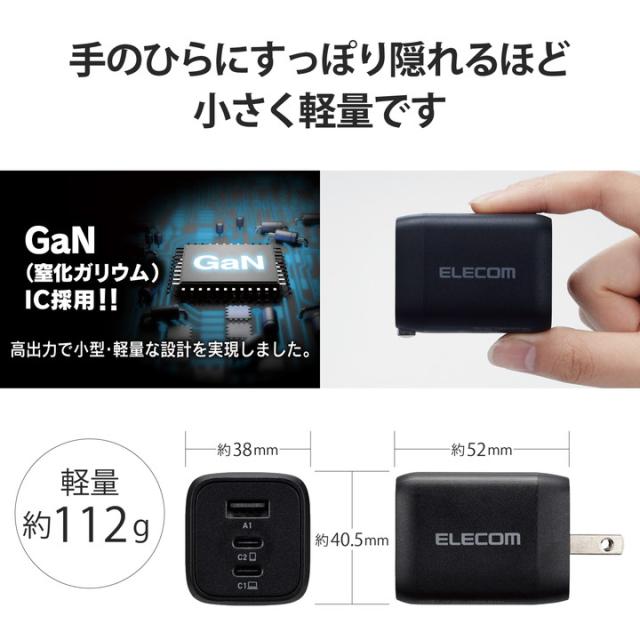 USB Type-C(TM)(USB-C(TM))ポートとUSB Type-Aポートの合計3ポートを搭載し、iPhoneなどのスマートフォンと完全ワイヤレスイヤホンとWindowsなどのノートパソコンを3台同時充電できるUSB AC充電器です。小型・軽量なので外出や出張などの際の持ち運びに便利です。![]() ■USB Type-C(TM)(USB-C(TM))ポートとUSB-Aポートの合計3ポートを搭載し対応するスマートフォン、タブレット、ノートパソコンなどを充電できる、GaN(窒化ガリウム)を採用し小型で軽量なUSB AC充電器です。 ■※USB Power Delivery規格65Wまでで充電できる機器に限ります。 ■出力端子が3ポートあるので、iPhoneなどのスマートフォンと完全ワイヤレスイヤホンとWindowsなどのノートパソコンを3台同時充電できます。 ■※2ポート以上同時出力時は合計最大65Wとなります。 ■USB Type-Cポートは、USB Power Delivery規格、オプションのPPS(Programmable Power Supply)規格に対応し、同規格に対応するノートパソコンやスマートフォン、タブレットなどを充電可能です。 ■USB Type-Cポート単独使用時、機器に応じて出力が5V/3A、9V/3A、12V/3A、15V/3A、20V/3.25Aと可変し、iPhoneなどのスマートフォンから、iPadなどのタブレット、高性能なWindowsノートパソコンまで幅広く充電できます。 ■USB-Aポートは、最大出力12W(5V2.4A)でスマートフォンや完全ワイヤレスイヤホン、スマートウォッチなどを充電、給電ができます。 ■接続された機器を自動的に見分けて適した出力で充電できる“おまかせ充電”に対応しています。 ■小型・軽量なので外出や出張などの際の持ち運びに便利です。 ■未使用時は、電源プラグを折りたたんで充電器本体に収納できるので持ち運びにも便利です。 ■耐トラッキング性の要求事項(PSE:電気用品安全法)を満たしたコンセントプラグを採用しています。 ■USB Power Delivery(パワーデリバリー)とは、アダプターと接続機器間で情報をやり取りすることで、その機器間における最適な電力を選択し、高速充電を実現するUSB規格です。 ■本製品はUSB-IFのテストと同等のテストを弊社独自で実施し、高い安全性が保たれており、USB Power Delivery対応製品にご使用いただけます。 ■PPS(Programmable Power Supply)とは0.2V単位で電圧を調整し、最適な電力で効率的に供給することができるUSB Power Delivery 3.0のオプション規格です。 ■※本製品のUSB Power Delivery最大出力は65Wです。PPS(Programmable Power Supply)最大出力は45Wです。 ■※本製品にケーブルは同梱しておりません。別途MFi認証品のUSB Type-C - Lightningケーブルや、エレコムのUSB規格認証USB Type-C - USB Type-Cケーブル等をご用意ください。 ■※機器本体や充電器が濡れた状態で充電すると、異常な発熱・焼損の原因となり大変危険ですのでおやめください。 ■※USB Type-C and USB-C are trademarks of USB Implementers Forum ■自社環境認定基準を1つ以上満たし、『THINK ECOLOGY』マークを表示した製品です。 ■廃棄物削減に取り組み、製品に同梱する取扱説明書等をペーパーレス化した製品です。 ■環境保全に取り組み、製品の包装容器におけるプラスチック重量を、社内基準製品より20%以上削減した製品です。 ■環境保全に取り組み、製品の包装容器が紙・ダンボール・ポリ袋のみで構成されている製品です。 ![]() ■対応機種:各USB Type-C(TM)(USB-C(TM))ポートからUSB Power Delivery (65W)及びオプション規格であるPPS(Programmable Power Supply)、またはUSB-Aポートから12Wの規格内で充電が可能な機器。2ポート以上同時接続時、合計最大65Wまでの出力で充電、給電可能な機器とその組み合わせ。 ■コネクター形状:USB Type-C(TM)(USB-C(TM))ポート×2、USB-Aポート×1 ■定格入力電圧:AC100〜240V、50/60Hz ■定格入力電流:2A ■外形寸法:幅約52mm×厚み約38mm×高さ約40.5mm ■重量:約112g ■カラー:ブラック ■コンセントプラグ仕様:90度スイング構造 ■使用温度:0℃〜35℃ ■法令:◇PSE 特定電気用品 ■保証期間:1年間 ■その他:※USB Type-C and USB-C are trademarks of USB Implementers Forum ■定格出力電力1:単独接続時:USB Type-C1(TM)(USB-C1(TM))/USB Type-C2ポート最大出力65W、PPS最大出力45W、USB-Aポート最大出力12W ■定格出力電力2:2ポート同時接続時(1):USB Type-C1+USB Type-C2ポート:合計最大出力65W、USB Type-C1ポート最大出力45W、PPS最大出力45W、USB Type-C2ポート最大出力20W、PPS最大出力20W ■定格出力電力3:2ポート同時接続時(2):USB Type-C1+USB-A ポート:合計最大出力57W、USB Type-C1ポート最大出力45W、PPS最大出力45W、USB-Aポート最大出力12W、USB Type-C2+USB-Aポート:合計最大出力15W、USB Type-C2ポート最大出力7.5W、USB-Aポート最大出力7.5W ■定格出力電力4:3ポート同時接続時:合計最大出力60W、USB Type-C1ポート最大出力45W、PPS最大出力45W、USB Type-C2ポート最大出力7.5W、USB-Aポート最大出力7.5W ■定格出力電圧1:単独接続時:USB Type-C1(TM)(USB-C1(TM))/USB Type-C2ポート:5V/9V/12V/15V/20V、PPS出力3.3〜16V、USB-Aポート:5V ■定格出力電圧2:2ポート同時接続時(1):USB Type-C1+USB Type-C2ポート:USB Type-C1ポート:5V/9V/12V/15V/20V、PPS出力3.3〜16V、USB Type-C2ポート:5V/9V、PPS出力3.3〜11V ■定格出力電圧3:2ポート同時接続時(2):USB Type-C1+USB-Aポー