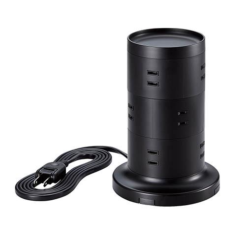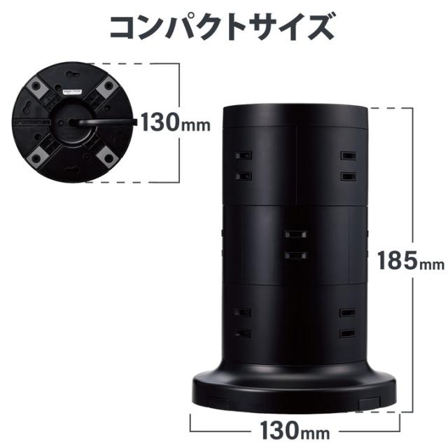 比較的小さな面積で設置ができ、360度あらゆる方向から接続できる12個の差込口を備えたタワー型の電源タップです。製品上部はトレー形状になっており、一時的に取り外した充電器などの小物を収納しておくことができます。二重構造の差込口やホコリ防止シャッターなどの安全機能、雷ガードやスイングプラグなどの便利機能を備えた使いやすい製品です。