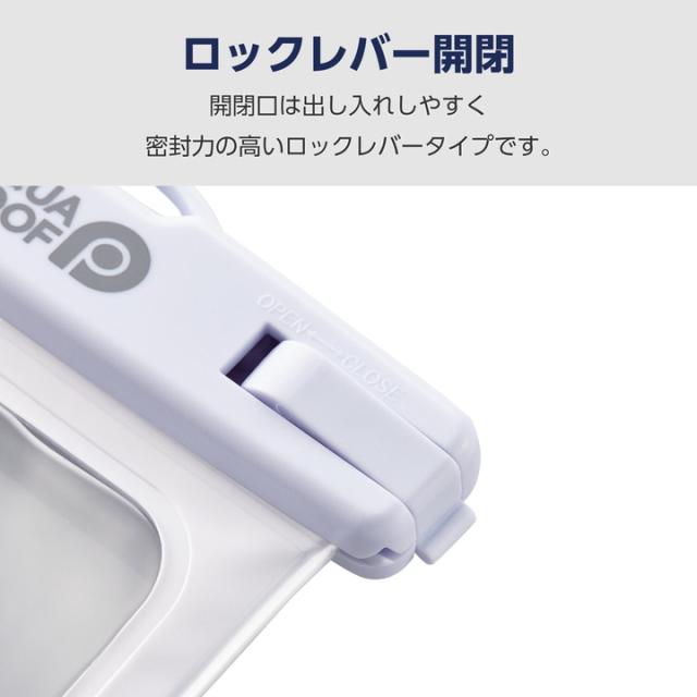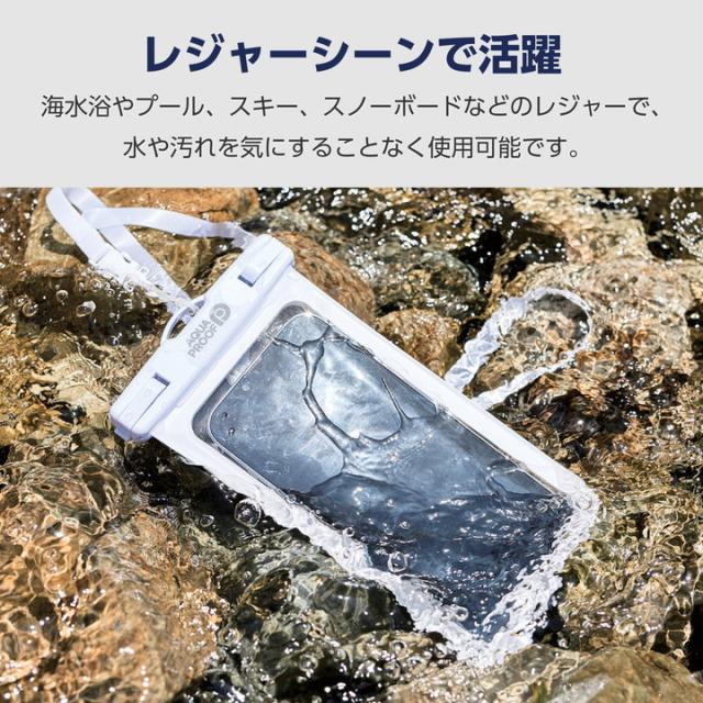 JIS保護等級IP58相当の防塵・防水性能を実現する、水深10mで30分まで使用可能なスマートフォン用防水ケース“AQUA PROOF”です。屋外で水や汚れを気にせず使用でき、装着したまま写真や動画撮影も可能!約6.9インチまでのスマートフォンに対応しています。