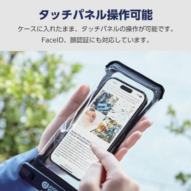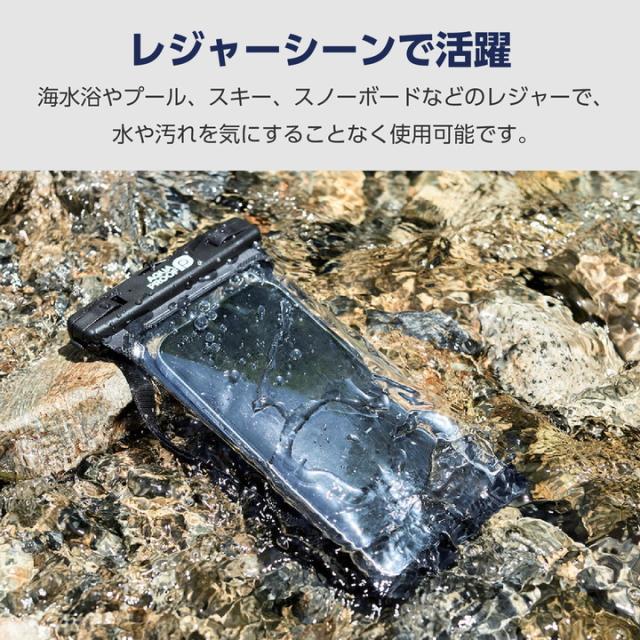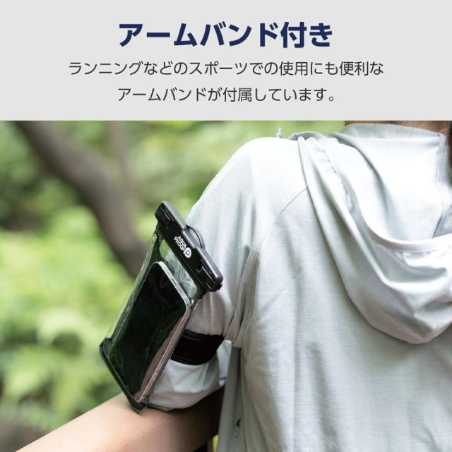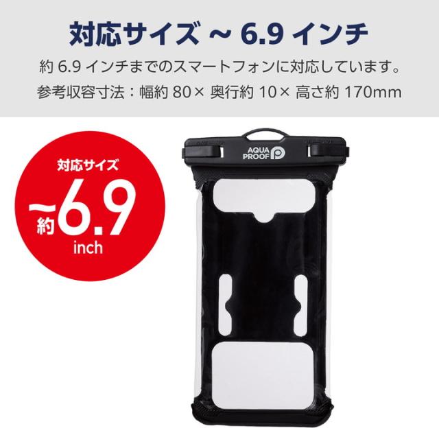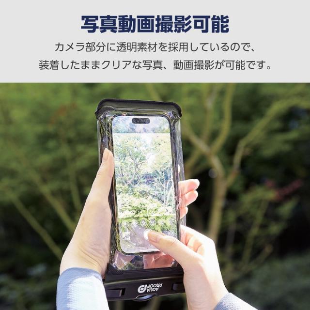 JIS保護等級IP58相当の防塵・防水性能を実現する、水深10mで30分まで使用可能なスマートフォン用防水ケース“AQUA PROOF”です。屋外で水や汚れを気にせず使用でき、装着したまま写真や動画撮影も可能!サイドボタンが押しやすい操作性抜群の立体構造です。アームバンド付きなのでスポーツでの使用にも便利です。約6.9インチまでのスマートフォンに対応しています。