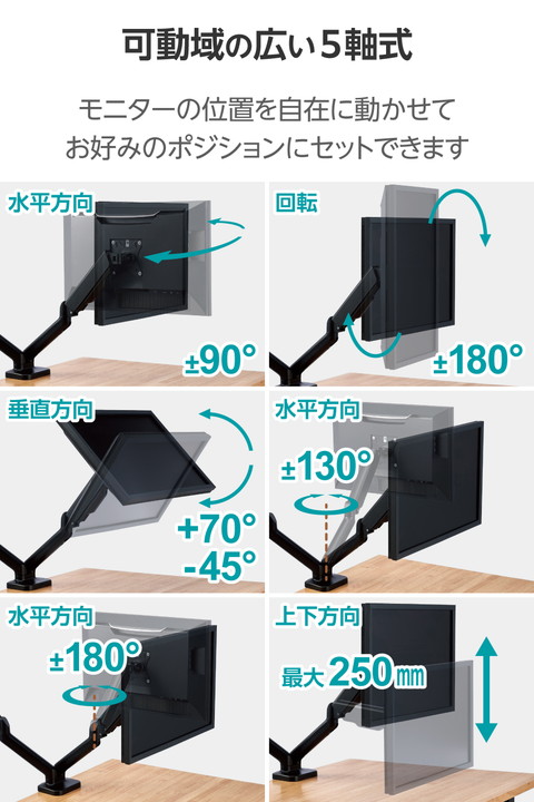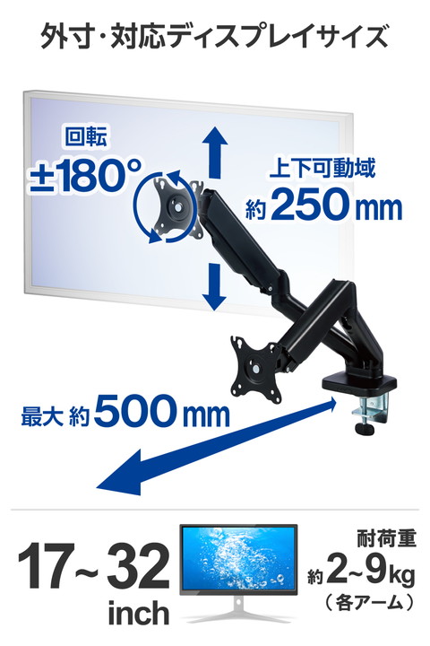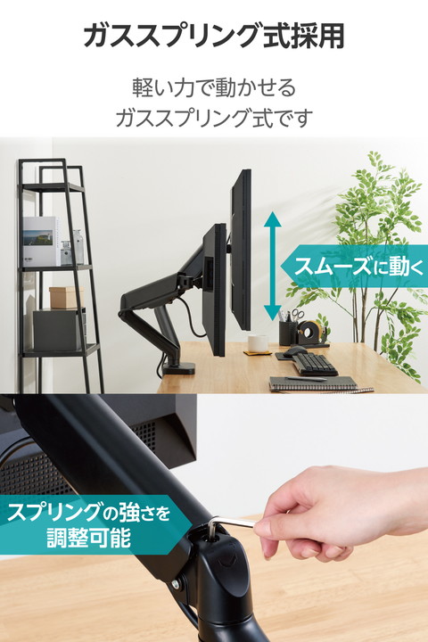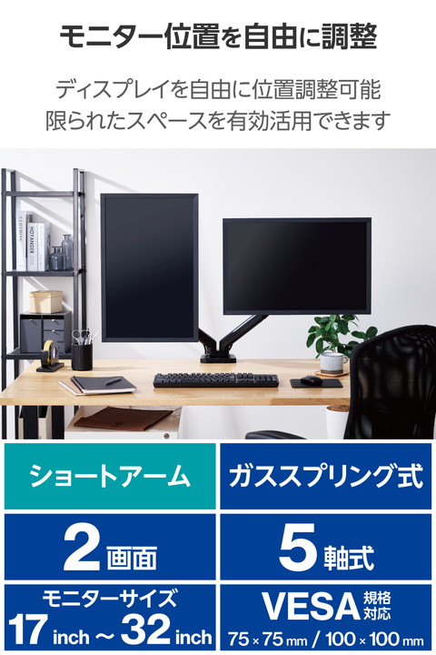 モニターの位置を自由に調整でき、デスクのスペースを有効活用!17〜32インチサイズのモニターを2台設置できるガススプリング式のデュアルモニターアームです。