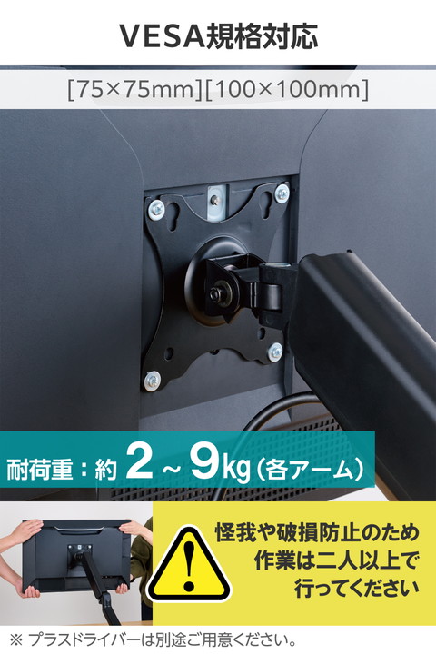 モニターの位置を自由に調整でき、デスクのスペースを有効活用!17〜32インチサイズのモニターを2台設置できるガススプリング式のデュアルモニターアームです。![]() ■17〜32インチサイズのモニターに対応するガススプリング式のデュアルモニターアームです。 ■モニター下のスペースを有効活用してデスクの上を広く使うことができます。 ■軽い力で動かせるガススプリング式です。 ■モニターの位置を自在に動かせて、お好みのポジションにセットできます。 ■モニターを2台設置できるデュアルアームタイプです。 ■可動域の広い5軸可動のアームタイプです。 ■VESA規格(75mm×75mm、100mm×100mm)に準拠したモニターに対応しています。 ■デスクの天板に挟んで固定するクランプ式と、天板に穴を開けてボルトを通して固定するグロメット式の2通りの取り付け方法が選べます。 ■モニター背面にネジをつけ、アームに取り付けたVESAマウントに下からネジ部分を引っ掛けて位置固定してご使用ください。 ■モニターの使用角度が決まったら、接続部のネジをしっかりと締めて固定してください。 ■モニターからのケーブルをすっきりまとめることができる、アームと一体型のケーブルホルダー付きです。 ■モニター取り付け後の可動がスムーズなのが特徴の製品です。ガススプリングの強さを調節することで、上下可動の硬さを調節することができます。 ■自社環境認定基準を1つ以上満たし、『THINK ECOLOGY』マークを表示した製品です。 ■環境保全に取り組み、製品の包装容器が紙・ダンボール・ポリ袋のみで構成されている製品です。 ![]() ■対応サイズ:17〜32インチ ■耐荷重:約2〜9kg(各アーム) ■サイズ:幅約983mm×奥行約112mm×高さ約590mm ■質量:約3.8kg ■カラー:ブラック ■取り付け画面数:2画面 ■材質:スチール、アルミ合金、ABS ■可動方式:ガススプリング式 ■対応規格:VESA規格(75mm×75mm、100mm×100mm) ■可動範囲:パン:左90度/右90度、ローテーション:360度、チルト:上70度/下45度 ■取り付け可能天板厚:クランプ(挟んで固定):10〜83mm、グロメット(穴に通して固定):10〜83mm ■固定方式:クランプ式/グロメット式 ■軸数:5軸 ■セット内容:アーム×1、クランプ用プレート×1、クランプ×1、グロメット用上プレート×1、蝶ナット×1、グロメット用ボルト×1、グロメット用下プレート×1 ■セット内容:ネジ×1、皿ネジ×1、六角レンチ(小)×1、六角レンチ(大)×1、ネジ(M4×12)×8、ネジ(M5×12)×8、ワッシャー×8 |