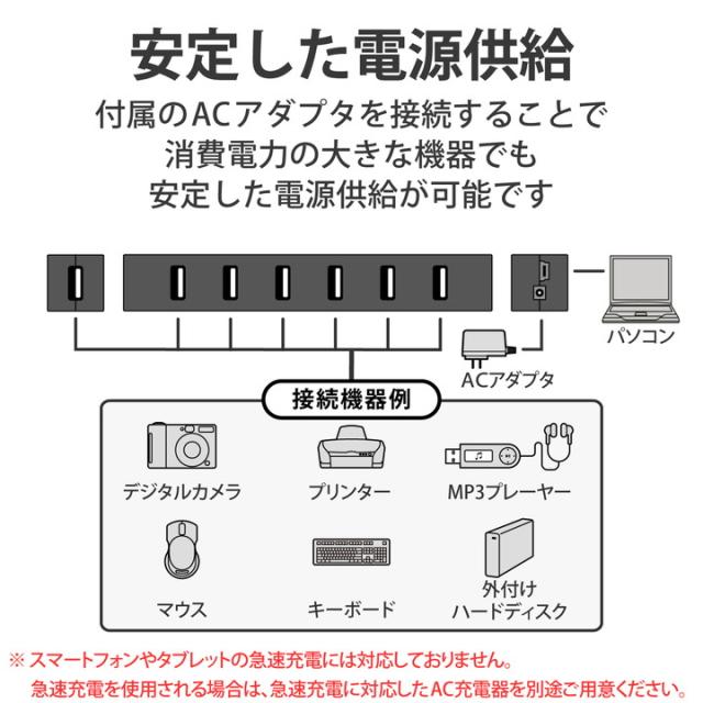 強力マグネットでガッチリ固定!USB機器を7個接続できる、マグネット付き7ポートUSBハブ。大容量電力のACアダプタで、USB機器を7個同時に接続しても安定動作!セルフパワー、バスパワー両対応モデル。![]() ■USB機器を7個接続してもガッチリ固定できる、マグネット付きの7ポートUSBハブです。 ■裏面に強力マグネットを装備していますので、スチール面に簡単に装着できます。スチールデスクなどの側面にも装着可能です。 ■フロントに6ポート、サイドに1ポートを備えたスリムデザインです。 ■セルフパワー、バスパワー両対応モデルです。 ■大容量電力のACアダプターが付属していますので、7個のUSB機器を同時に接続しても電力が不足せず、安定した動作を実現します(※)。 ■※スマートフォンやタブレットの急速充電には対応しておりません。急速充電を使用される場合は、急速充電に対応したAC充電器を別途ご用意ください。 ■※付属の専用ACアダプター以外を使用しないでください。 ■電力供給時に点灯する電源LEDが付いています。 ■本製品はUSBポートを増設するための製品です。本製品を使用してスマートフォン・タブレットを充電することはおすすめできません。 ![]() ■インターフェース:USB2.0(USB1.1インターフェイス接続時は、USB1.1互換で動作) ■コネクター形状:パソコン側(アップストリームポート):USB Mini-B ポート、USBハブ側(ダウンストリームポート):USB-Aポート×7 ■最大転送速度:480Mbps ※USB2.0ハイスピードモード時 ※理論値です ■アップストリーム(パソコン側)ポート数:1ポート ■ダウンストリーム(周辺機器側)ポート数:7ポート ■USBケーブル方式:USB2.0ケーブルが付属 ■USBケーブル長:1.5m ※コネクターを除く ■電源方式:セルフパワー(付属ACアダプター使用)とUSBバスパワーの両用 ■供給可能電流:セルフパワー時:7ポート合計3500mA以内、バスパワー時:7ポート合計300mA以内 ■DCケーブル長(付属ACアダプター):1.2m ※コネクターを除く ■外形寸法:幅23mm×奥行144mm×高さ23mm ■重量:66g ※ケーブル、ACアダプター除く ■動作環境:温度 0℃〜60℃、湿度10〜85%(結露なきこと) ■保証期間:6カ月間 ■付属品:USB2.0ケーブル×1、専用ACアダプター×1 ■対応OS(Windows):Windows 11、Windows 10、Windows 8、Windows 7(SP1)、Windows 32bit版Vista(〜SP1)、32bit版XP(SP1〜SP3)、2000(SP4)、Me、98が動作するWindowsパソコン ※各OSの最新バージョンへのアップデートや、サービスパックのインストールが必要になる場合があります。 ■対応OS(macOS):macOS Ventura 13/macOS Monterey 12/macOS Big Sur 11/macOS High Sierra 10.13/Mac OS X 10.3〜10.7が動作するMacintosh ※各OSの最新バージョンへのアップデートや、サービスパックのインストールが必要になる場合があります。 ■カラー:ブラック ■環境配慮事項:本製品は日本国内の電源を想定して設計されていますので、日本国外ではご使用いただけません。 ■電気用品安全法:PSE適合(ACアダプター) |