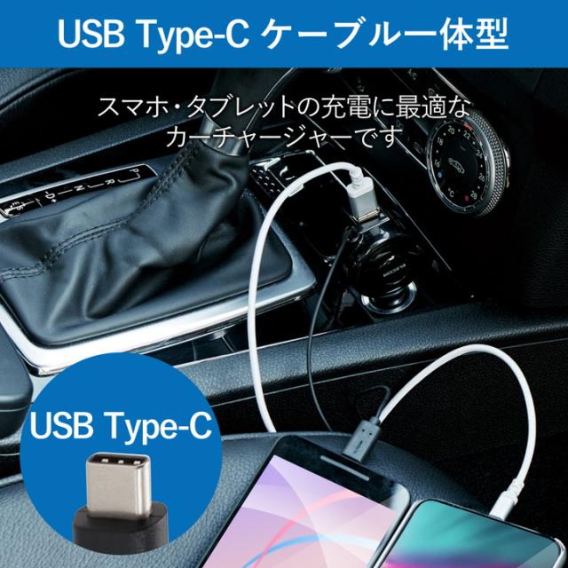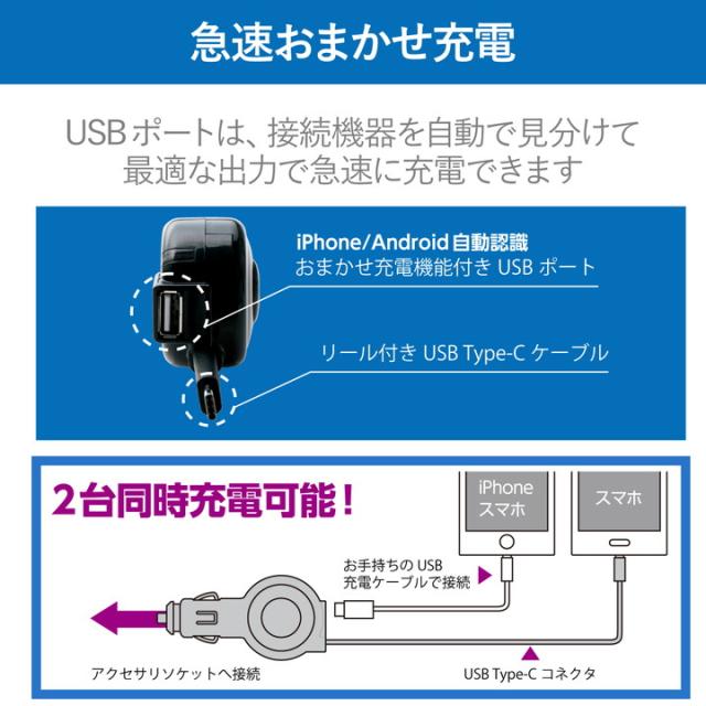 USB Type-Cコネクタに対応! 巻取り式のUSB Type-Cコネクタと、おまかせ充電に対応したUSBポートを搭載し、2台のスマホを同時に充電できる車載充電器。