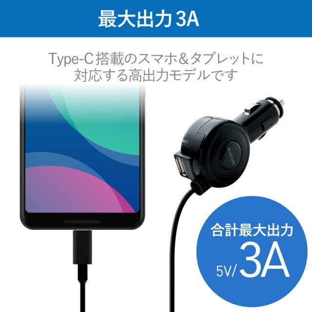 エレコム 車載充電器 カーチャージャー 2台同時充電可能 巻取りタイプ 3A Type-C&USB 60cm ブラック 60cm┃MPA-CCC04BK