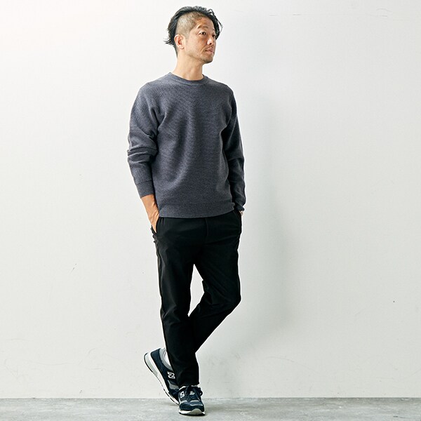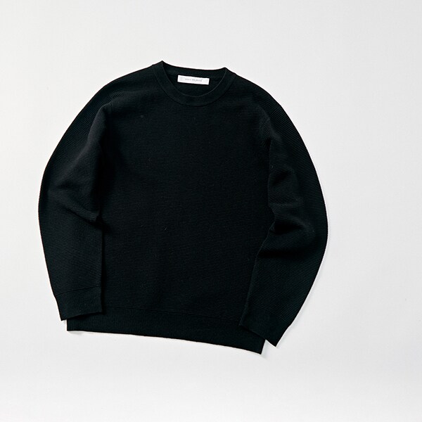 細かいリップル組織のジャージライクなクルーネックニット。