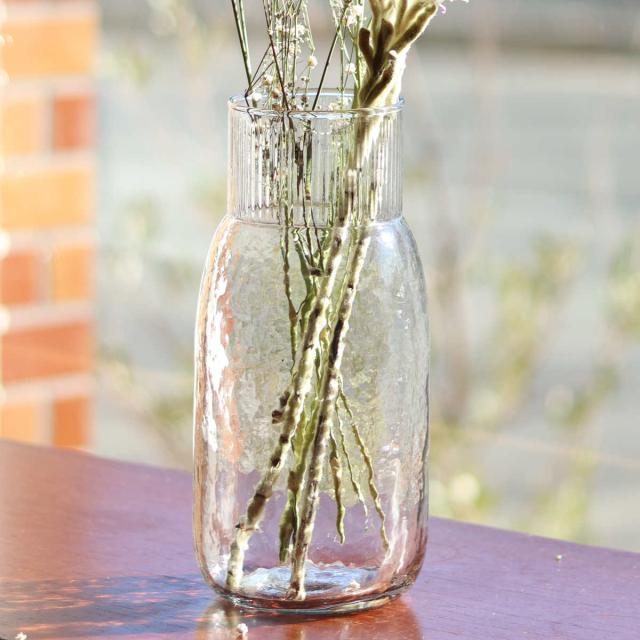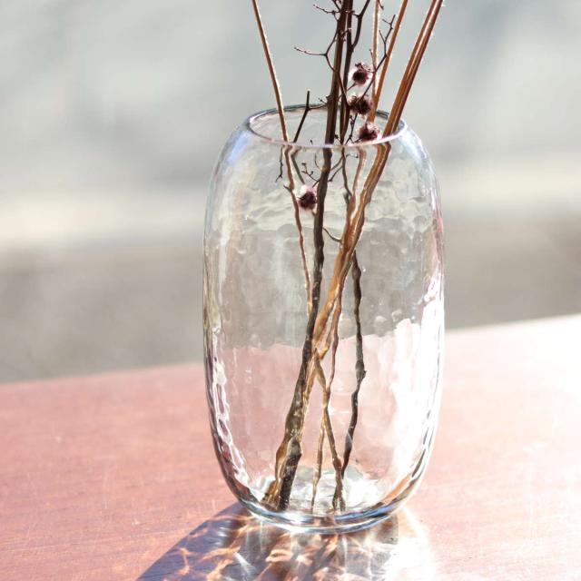 シンプルながら、表面の凸凹が特徴的なハンドメイドのフラワーベースです。口が狭いことにより花が動きにくいため、一輪挿しから花束まで、どのような花を飾ってもバランスが取りやすいです。また、安定感があるので、大きめのアイテムを生けるのにもおすすめです。