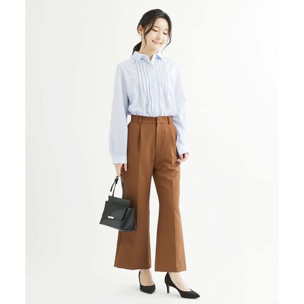 膝で少し絞ったセミフレアーのラインが美脚効果も期待できるパンツ。ウエストの1タックとセンタープレス、しっかりとウエストをホールドするベルトできちん見えが叶います。