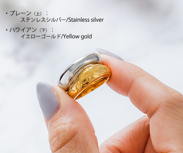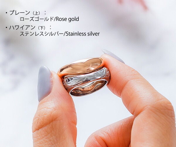 | コメント | 丸みのある美しい曲線が指先にフィットする、ボリューム感抜群で個性的なワザありなリング。 サッと着けるだけで、手元が華やかな雰囲気に。セットリングで存在感抜群ですが、プレーン(鏡面)とハワイアンの1本ずつでも存在感があり単品でもお使いいただけます。 その日の気分で色んな楽しみ方のできるちょっとお得なセットリングです。 また、大きめのサイズもあり男性にも使いやすいデザインです。 サージカルステンレス使用のハワイアンジュエリー。 今まで金属アレルギーでハワイアンジュエリーが着けれなかった方にオススメ!! 医療用に使われているサージカルステンレスは肌に優しく、金属アレルギーでアクセサリーをつけられない方にも安心です。シルバーアクセサリーより軽くて丈夫で変色しにくい素材ですので、ティッシュや柔らい布などでサッと拭くだけでいいので、お手入れが簡単です。 注意:お風呂や温泉で変色しにくいですが、外していただく事をおススメいたします。 ※プレーン(鏡面)とハワイアンのセットの組合せのみでの販売となります。 プレーン同士で2本・ハワイアン同士で2本の組み合わせはお選びいただけません。 |
