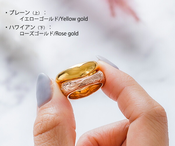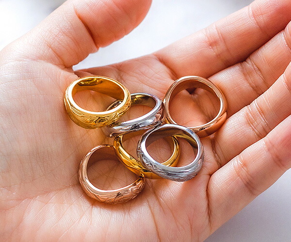 | サイズ | リング幅:約4mm〜約6.5mm(最大) 厚み:約2.5mm〜約3mm ※プレーン(鏡面)/ハワイアン共通 |