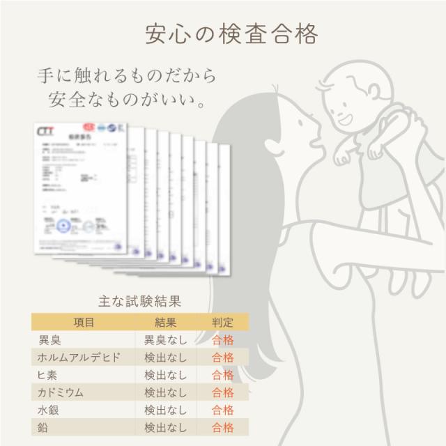 また、 異臭 ホルムアルデヒド ヒ素 カドミニウム 水銀 鉛 の試験結果はすべて合格いたしております。