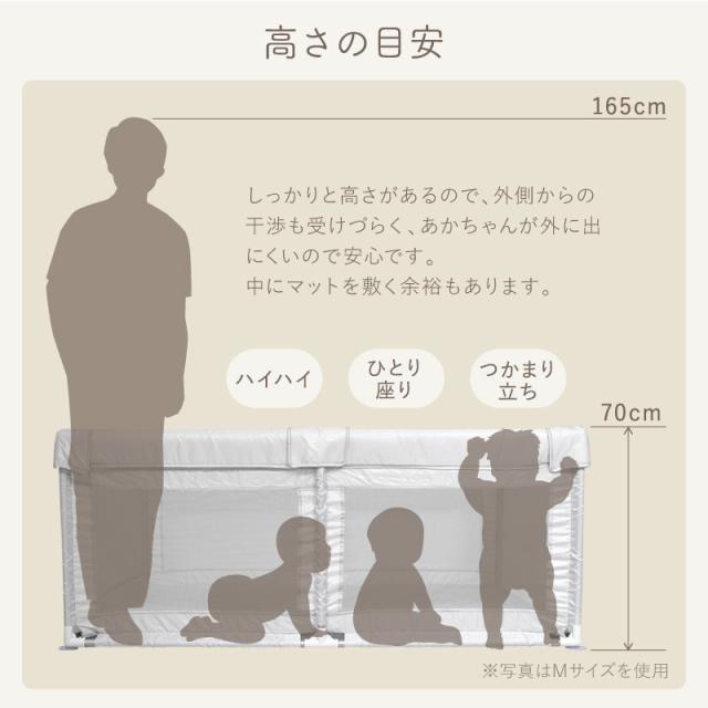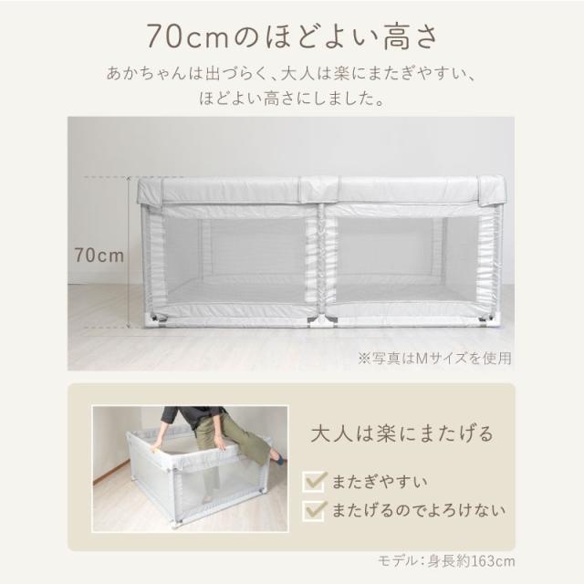 一般的には高さが60cm程度が多い中、高さは70cmのハイタイプで、赤ちゃんは出づらく大人はまたげる高さです。