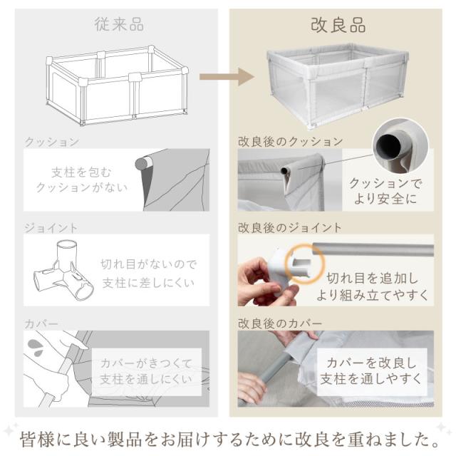 従来モデルにやわらかクッション材を入れたり、組み立て易く改良を重ねたベビーサークルです。