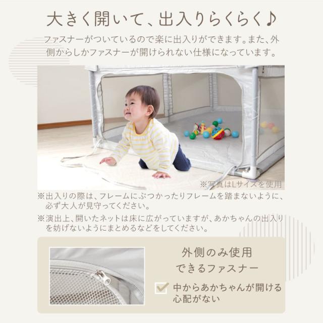 出入口は大きく、各サイズ1箇所のファスナー式で、外側からのみ開けられ、中から赤ちゃんが開けてしまう心配がございません。