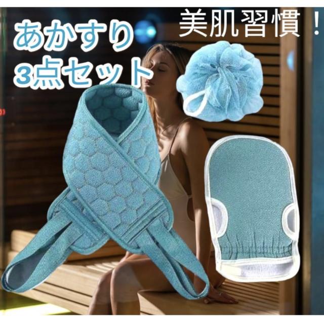 あかすり アカスリ タオル ミトン 泡立てネット 自宅 韓国 垢すり スベスベお肌 ブルー 3点セット