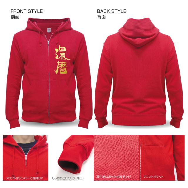 高品質でしっかりとした厚手生地の赤ジップパーカーに100回以上洗っても落ちないタフなプリントで生産しております。
