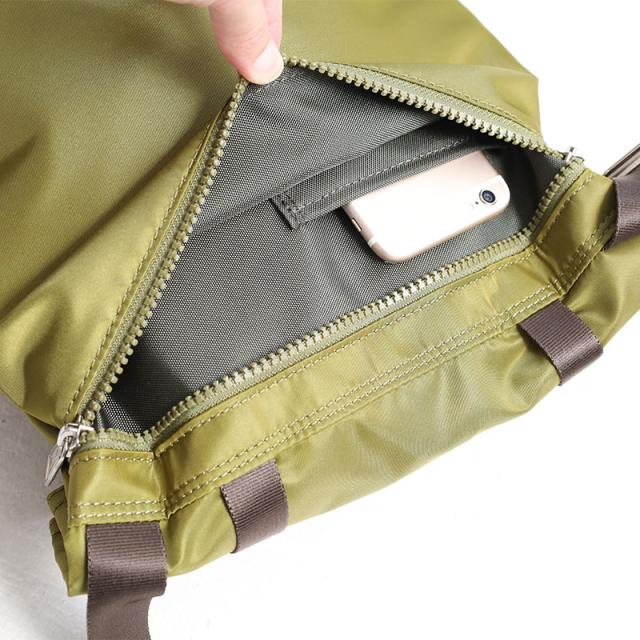 フラップ部分、ショルダー調節部分に金属パーツを使い全体のアクセントとなっております。背面部分にはファスナーポケットがついており、ポケット内にも小さいオープンポケットが付いておりますので、鍵等の収納に適しております。以前の「SHRINK NYLON」シリーズのアップデートモデルになっており、以前のカジュアルさを残しつつも生地、パーツ等で上品さをおり混ぜたマイナーチェンジモデルになります。