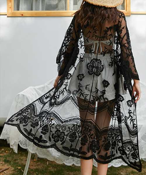 レディース 花柄刺繍レースロングガウンウエストリボンカーディガン