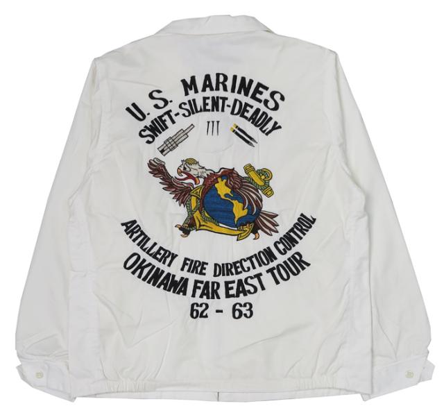 米海兵隊の砲兵火力指令統制部隊が1962年から1963年にかけて極東ツアーの際に沖縄に駐留し、その記念として現地で特別にオーダーして製作された一着。海兵隊のシンボルである鷹には躍動感があり、綺麗な色使いと文字数の多い柄は秀逸で、このような柄はビンテージ市場においても滅多にお目にかかれない稀少な存在。SWIFT(迅速な、早い)、SILENT(静かな)、DEADLY(命取り、致死)はこの部隊が使用する武器の凄まじさを表している。