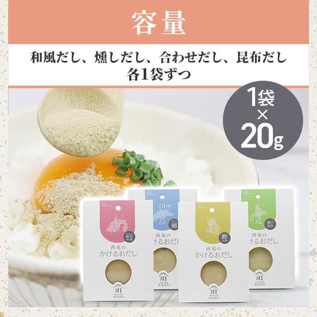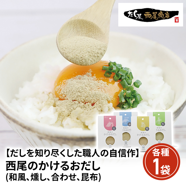商品名 【だしを知り尽くした職人の自信作】西尾のかけるおだし(和風、燻し、合わせ、昆布) 各種1袋 容量 20g/袋×各種1袋 原材料名 【和風だし】かつおのかれふし(鹿児島県製造)、昆布(北海道製造)