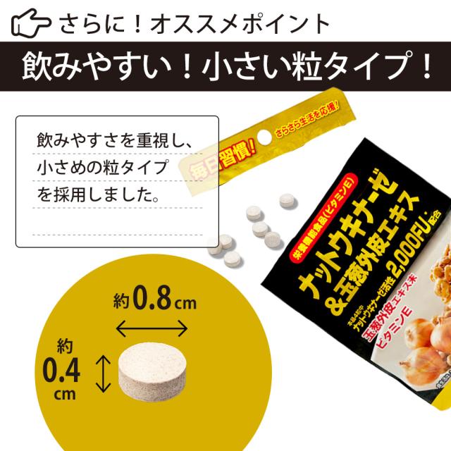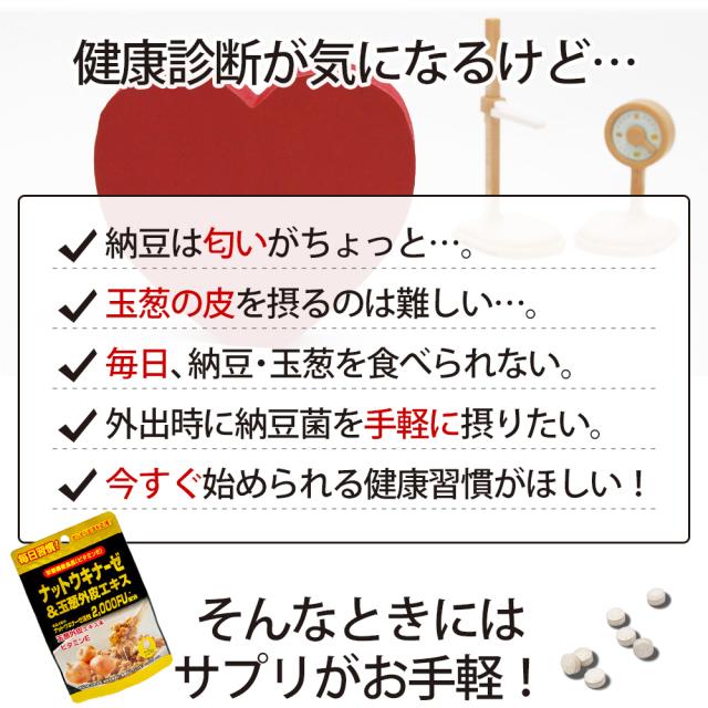 | 納豆菌培養エキス末:100mg(ナットウキナーゼ活性:2,000FU)、玉葱外皮エキス末:20mg |