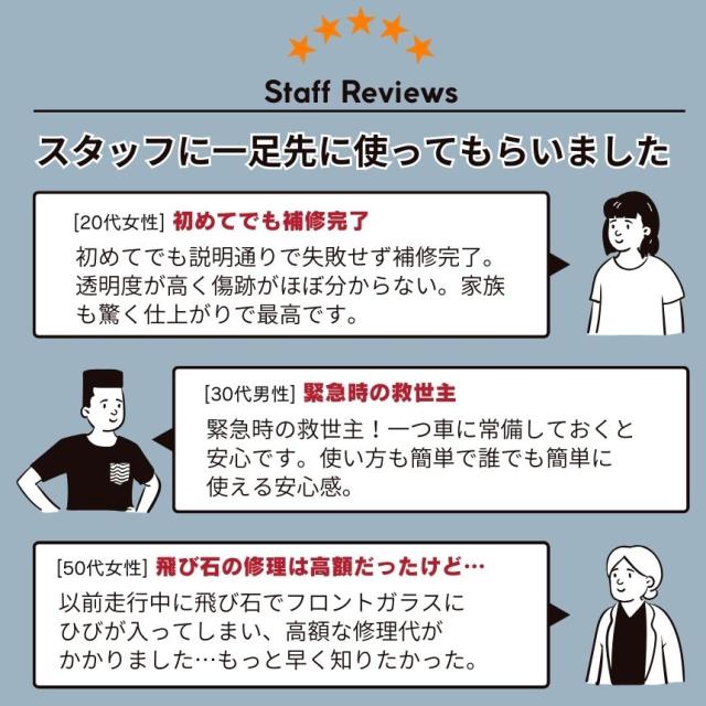 このガラスリペアキットなら樹脂製の修復剤が約15〜20分で硬化し、フロントガラスの傷や欠けを穴埋めしてくれます。
