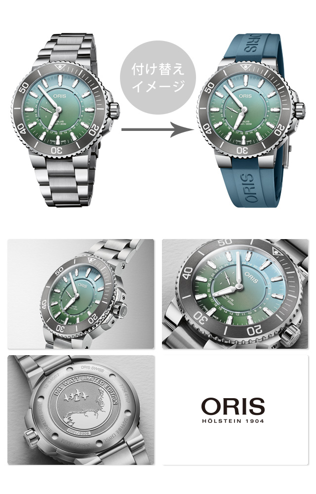 正規品 7年保証キャンペーン オリス 43.5mm 数量限定モデル 替えベルト スイス製 メンズ 腕時計 01 743 7734 4197-Set ORIS DAT WATT LIMITED EDITION II アナログ グリーン ◆ORIS(オリス)は、ポール・カッティン氏とジョージ・クリスチャン氏の2人によってスイスのヘルシュタインで創設されました。近くを流れる小川にちなんで社名をオリスと命名。手頃な価格ながら、革新的で高機能かつ実用的な機能を備えた本格機械式時計で知られ、世界中の時計ファンから愛されているブランドです。 ワッデン海の、多様性に満ちた大変重要なエコシステムを維持する活動を支援する、アクイスをベースにした限定モデル。スイス製自動巻ムーブメントに、サーキュラーデイトインディケーターという珍しいモジュールを加えました。30気圧(300メートル)防水で、ブレスレットと交換用のラバーストラップが付属します。ワッデン海がユネスコ世界遺産に登録された2009年に因んで2009本限定です。 機械式腕時計 発売日:2023年8月発売