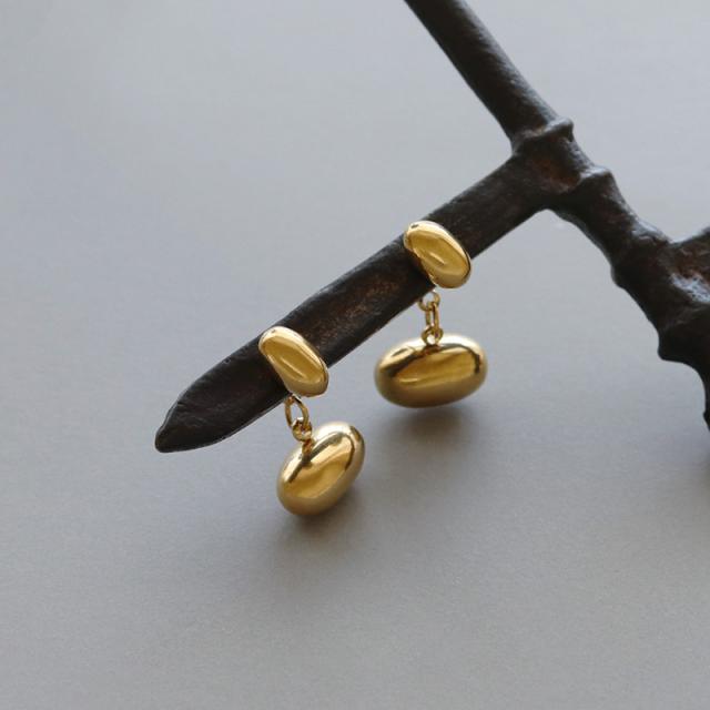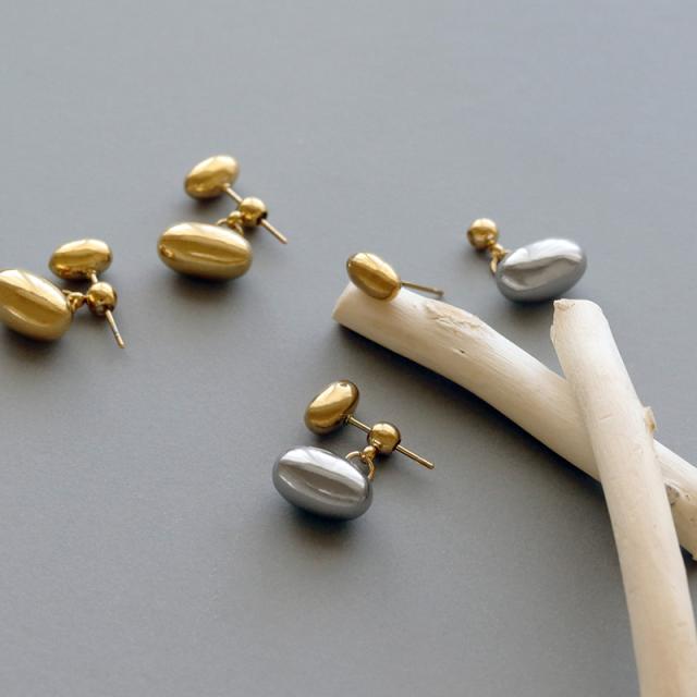 少し重量感のあるぷっくりとした楕円モチーフの艶感が美しく、ふとした仕草で揺れるシルエットが耳元に映えます。