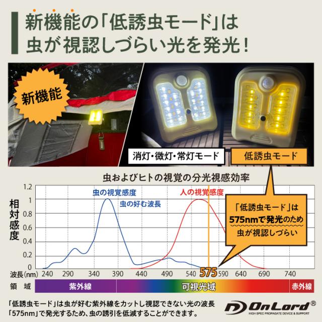 ★低誘虫モードは虫が視認できない光の波長「575nm」で発光するため、虫の誘引を低減。※不快害虫のみ
