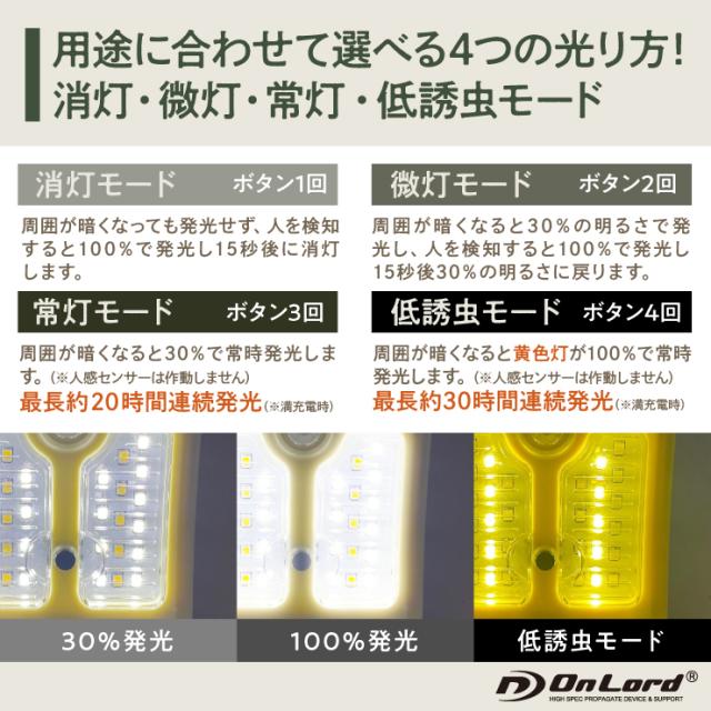 ・低誘虫モード(ボタン4回):周囲が暗くなると黄色灯が100%で常時発光します。(※センサーは作動しません。)最長約30時間連続発光(※満充電時)