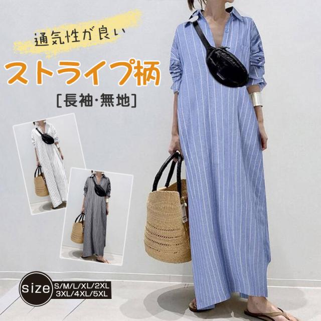 マキシワンピース レディース ロングワンピース 長袖 シャツワンピ 大きいサイズ チュニック ロング丈 ストライプ柄 体型カバー