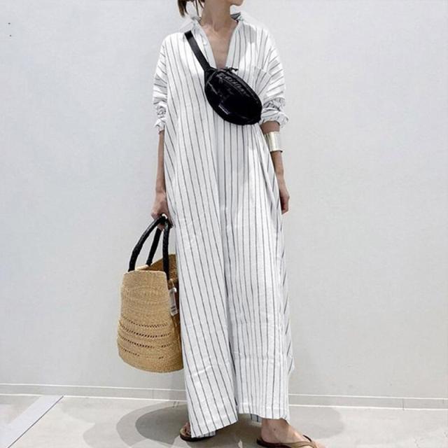 マキシワンピース レディース 夏 ロングワンピース 長袖ワンピース aライン 大きいサイズ ロングワンピ フレア ストライプ柄 体型カバー マキシ丈 vネック ゆったり aラインワンピース ポケット付き レトロ 着痩せ リラックス 春 秋 部屋着
