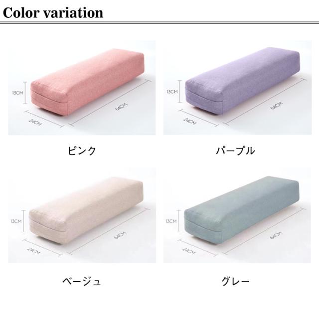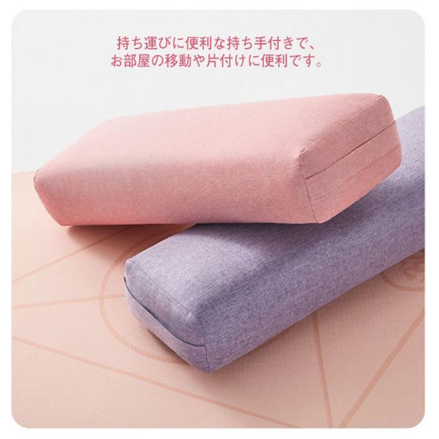 | 【ヨガボルスター】【補助クッション】【4color】 「長枕」や「支える」という意味を持つボルスター。 ヨガのポーズやリラクゼーションの補助をしてくれるので、ヨガ初心者の方や身体の硬い方におすすめです。 とても肌触りが良く、通気性に優れたさらっとした生地を使用し、カバーは取り外して洗濯が可能です。 ※中のクッションは洗濯不可です。 中のクッションには高弾性のスポンジクッションを使用しているため、身体をしっかりと支えてくれます。 持ち運びに便利な持ち手付きで、お部屋の移動や片付けに便利です。 ヨガでの使用はもちろんのこと、フットレストや胡座クッションなどとしてもお使いいただけます。 | |