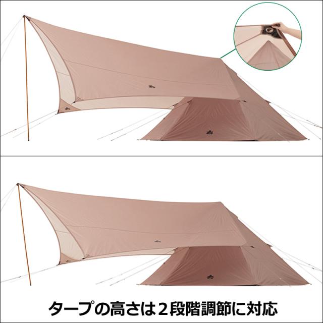 ヘキサ型タープは高さ2段階調節に対応しており、傾斜がかかるように設計することで雨や風に強い構造としています。