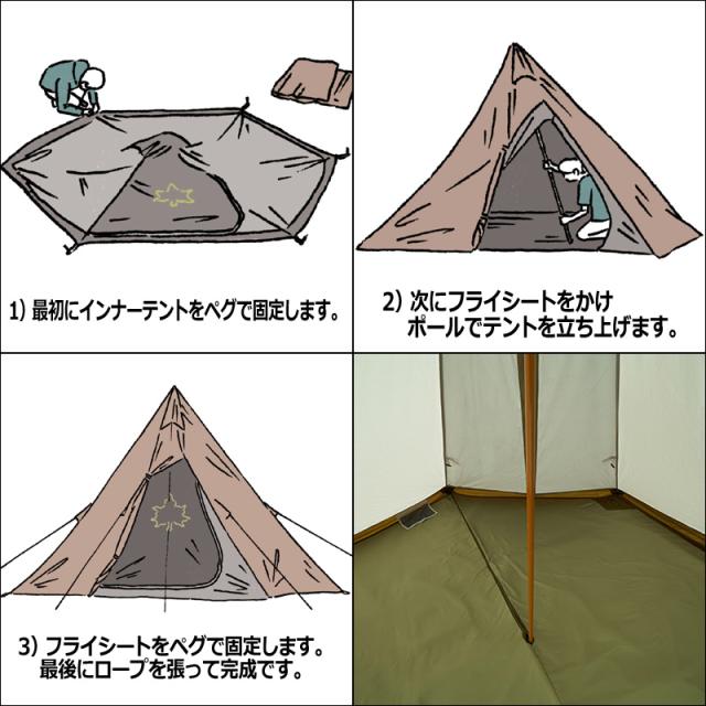 フロアシートと地面の間に敷き、四隅をテントフレームに結びつけ、ティピーの中央ポールを囲うようにマットを敷き、生地の合わせ部分を留めるだけ。