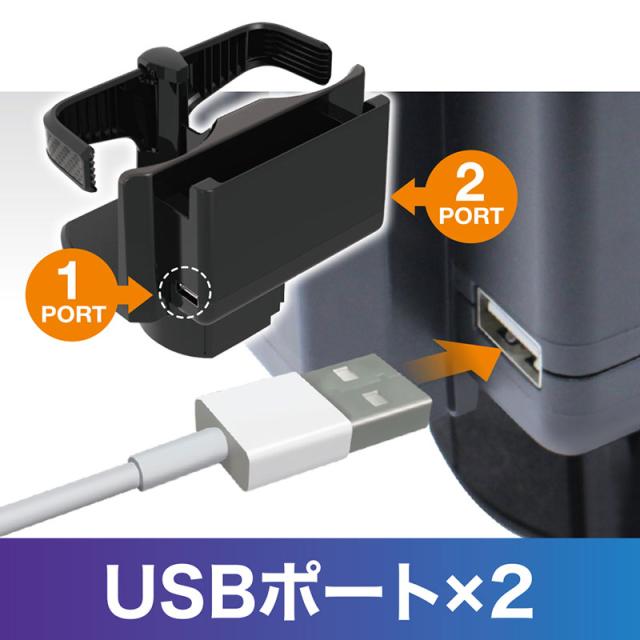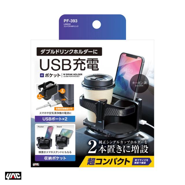 ヤック/YAC USB付きコンパクトWドリンク ドリンクホルダー USB2ポート付 充電も出来る ドリンク2本置き 車内収納 PF393